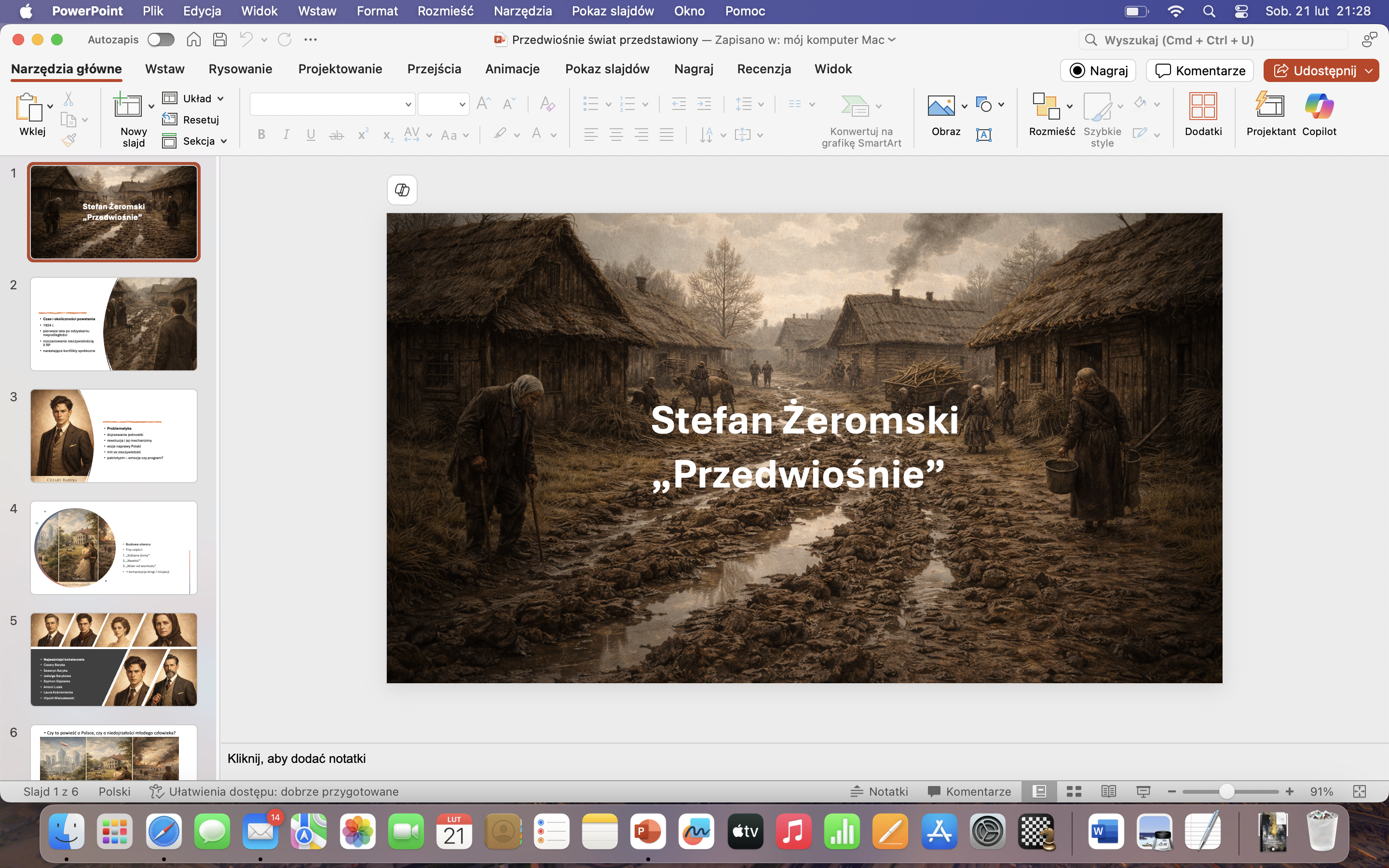 Prezentacja na temat świata przedstawionego w "Przedwiośniu” to uporządkowana, klarowna i merytoryczna analiza jednej z najważniejszych powieści Stefana Żeromskiego. Łączy syntetyczność z interpretacyjną głębią, stanowiąc wartościowe narzędzie dydaktyczne – zarówno do pracy na lekcji, jak i do powtórzenia materiału przed egzaminem maturalnym. To przykład rzetelnego opracowania literackiego, które porządkuje wiedzę, prowokuje do myślenia i zachęca do własnych interpretacji.