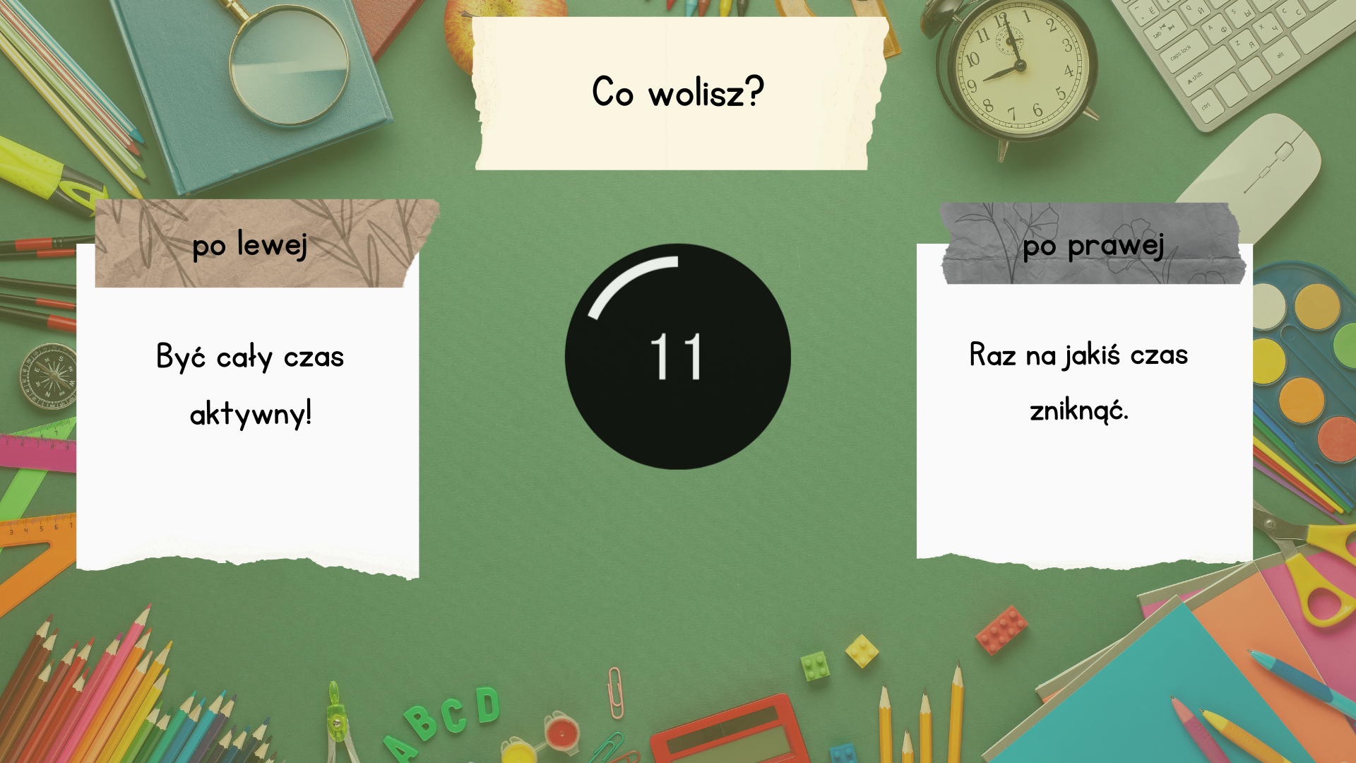 Zabawa polega na ustawianiu się po lewej lub po prawej stronie sali w zależności od tego z którym hasłem bardziej się utożsamiają uczestnicy. Wszystko to okraszone jest humorystycznym komentarzem. W tle słychać miłą muzykę.