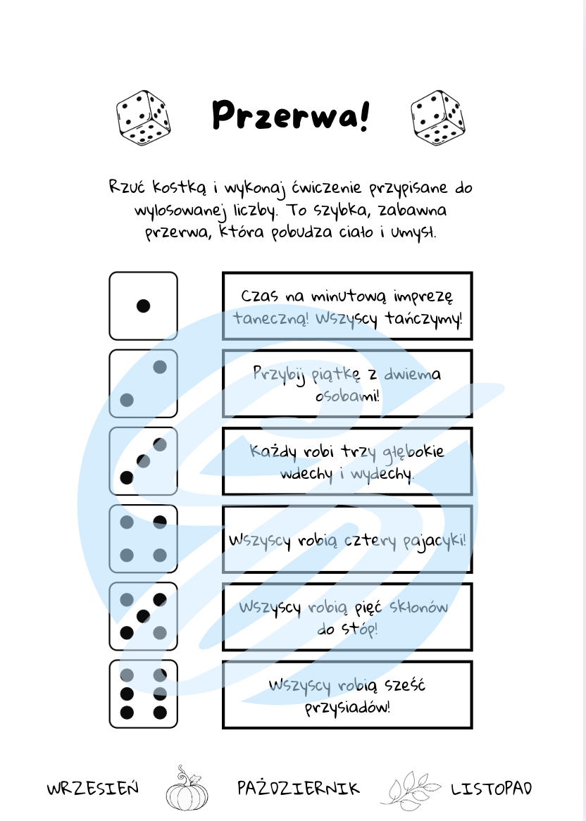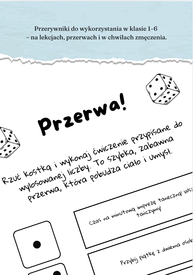 Każda karta zawiera 6 prostych zadań – wystarczy rzut kostką, by wylosować ćwiczenie, które cała klasa wykonuje razem. Bez hałasu, bez rywalizacji, bez wychodzenia z sali.