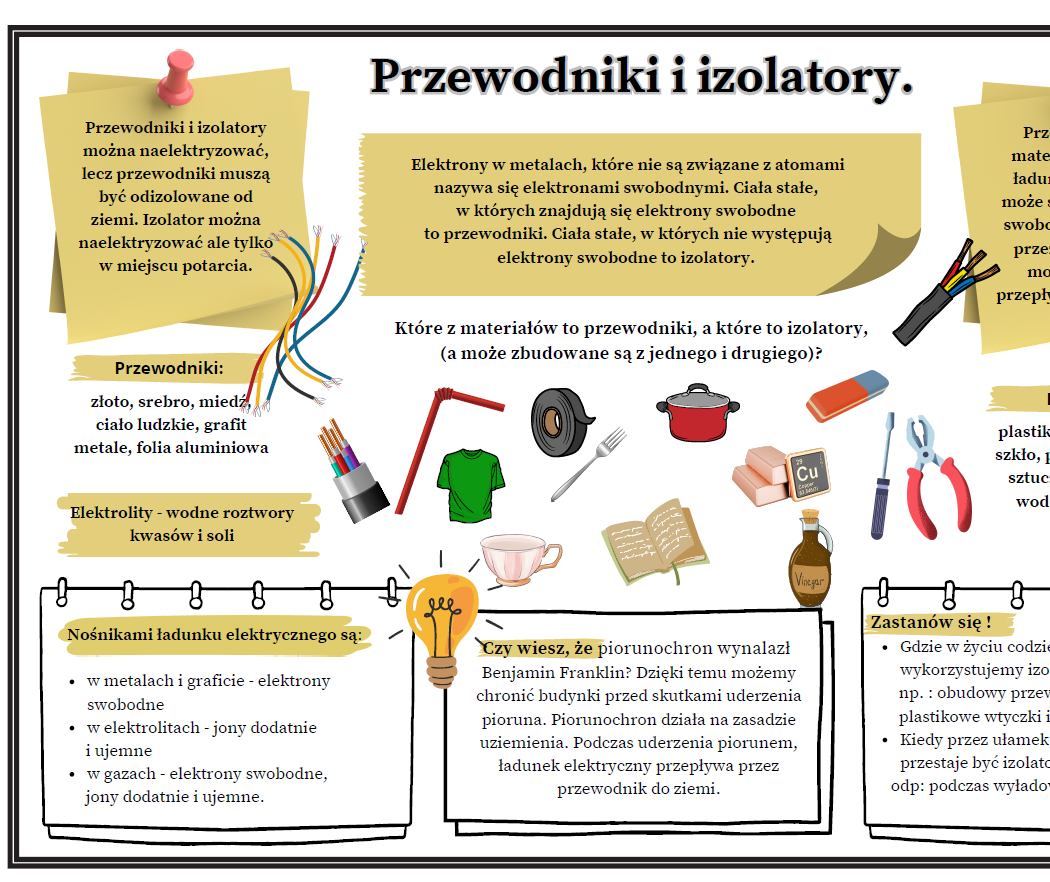 Materiał zawiera najważniejsze informacje o przewodnikach i izolatorach. W zestawie znajdują się 2 karty A4, jedna uzupełniona dla nauczyciela druga do uzupełnienia dla ucznia. Temat dotyczy budowy przewodników i izolatorów, czy można je naelektryzować oraz jakie występują w nich nośniki ładunku elektrycznego. W zestawie znajdują się pytania dla ucznia oraz ciekawostki.