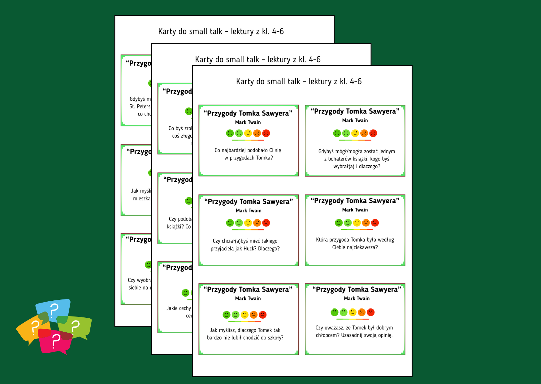 18 pytań typu „Karty small talk” do „Przygód Tomka Sawyera”. Takie pytania mają charakter swobodny, zachęcają do refleksji, rozmowy i dzielenia się opinią, a nie tylko sprawdzają wiedzę. Mogą być wykorzystywane na lekcjach jako forma integracji z lekturą lub podczas luźniejszych rozmów literackich. Dzięki nim można ćwiczyć wypowiedź argumentacyjną. Zasady: uczeń losuje kartę i odpowiada na pytanie (lub wszyscy uczniowie odpowiadają na to samo pytanie).