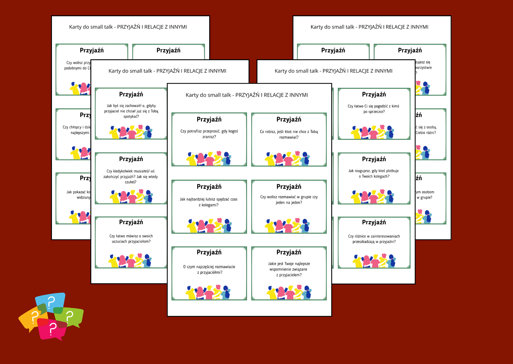 54 pytania typu „Karty small talk” (9 stron A4 po 6 fiszek), dotyczących przyjaźni i relacji z kolegami i koleżankami – pytania są uniwersalne i mogą być używane podczas zajęć integracyjnych, lekcji wychowawczych, spotkań bibliotecznych lub jako inspiracja do rozmów. Zasady: uczeń losuje kartę i odpowiada na pytanie (lub wszyscy uczniowie odpowiadają na to samo pytanie).