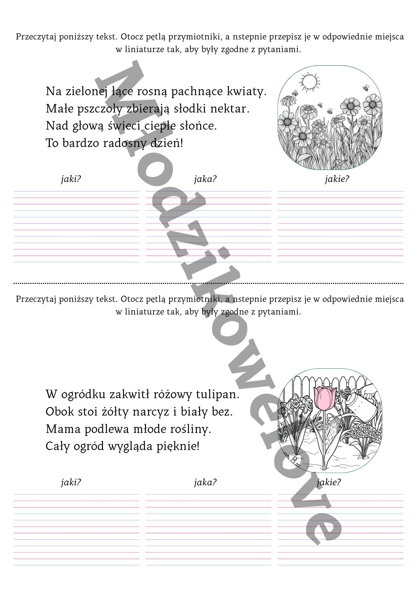 Materiał na powtórki gramatyczne z przymiotnikiem. Po cztery krótkie teksty, na cztery pory roku. z tekstów należy wypisać przymiotniki w odpowiednie miejsca w liniaturach tak, aby były zgodne z pytaniami.