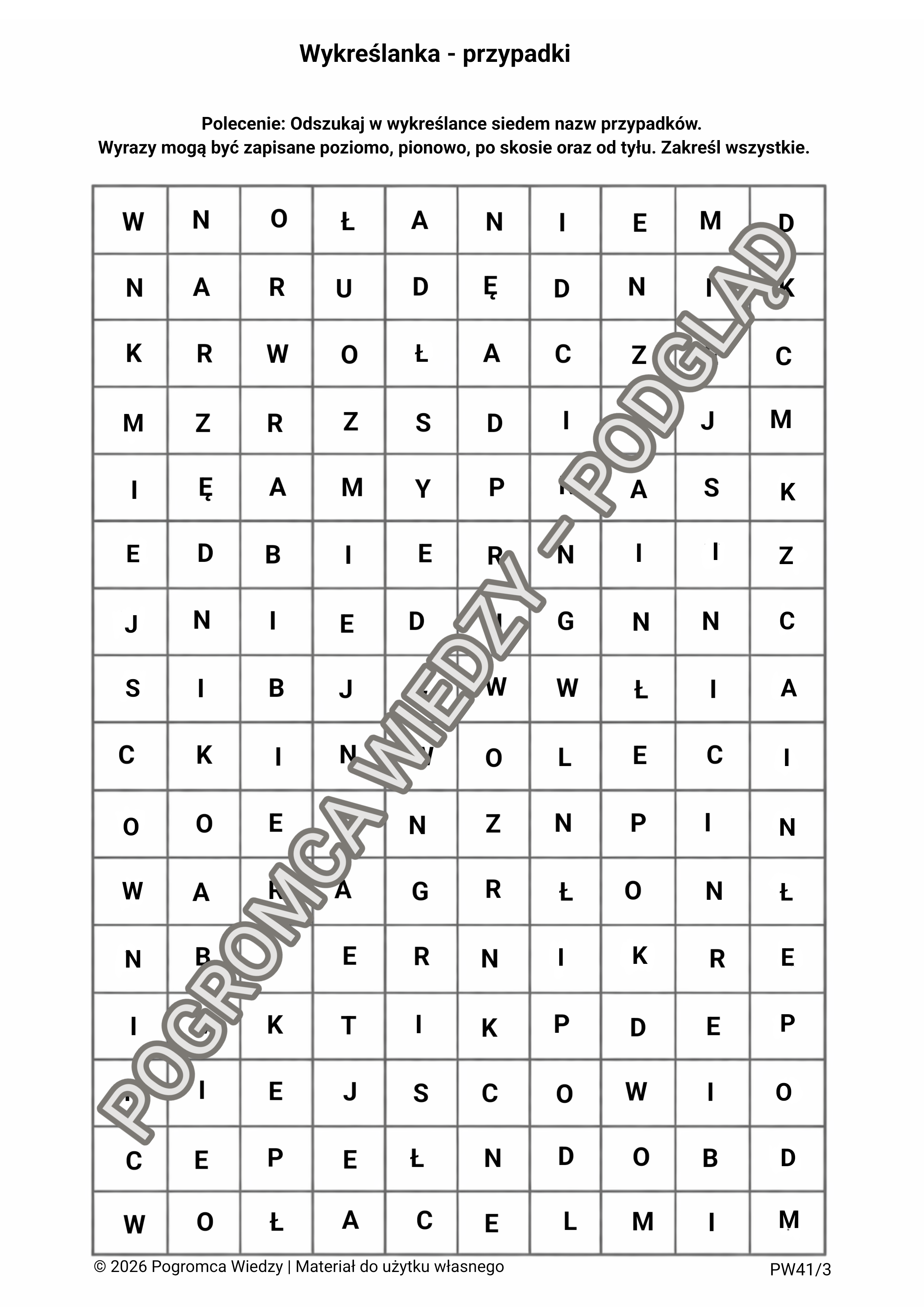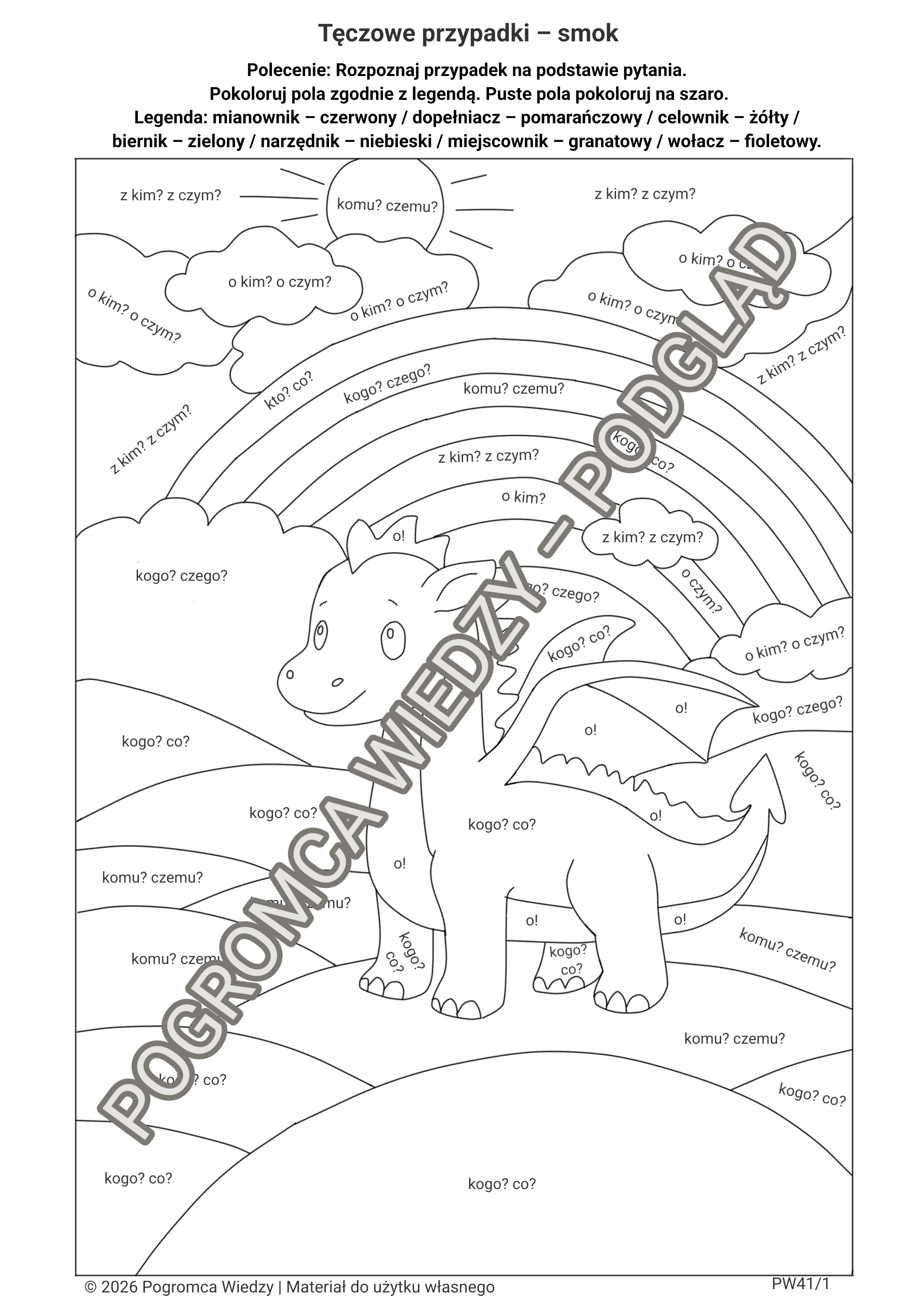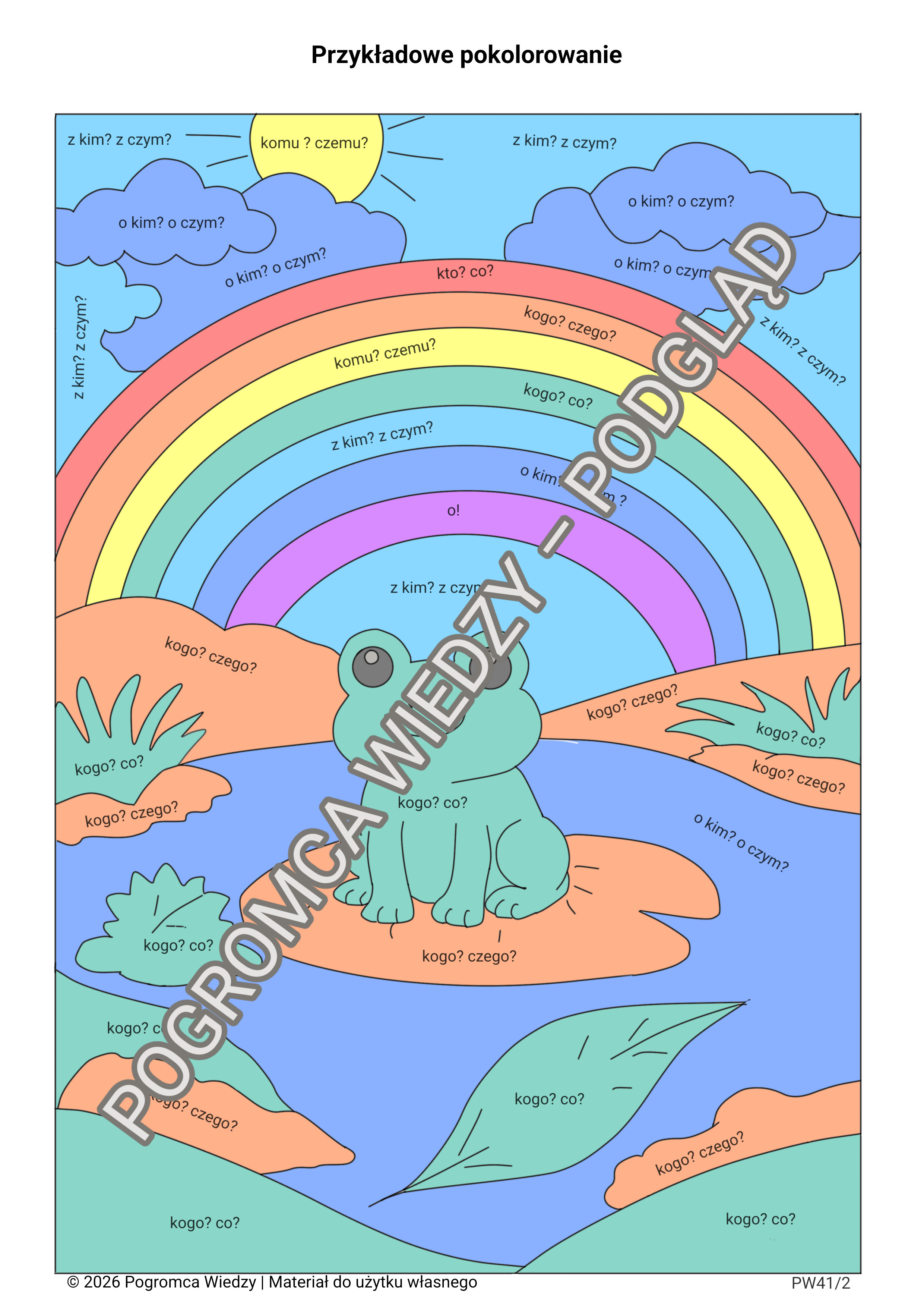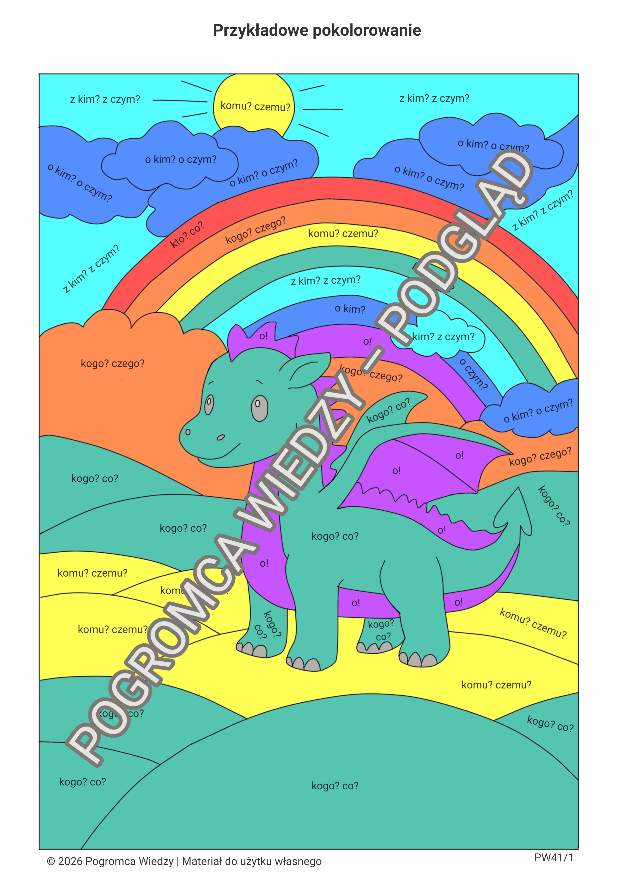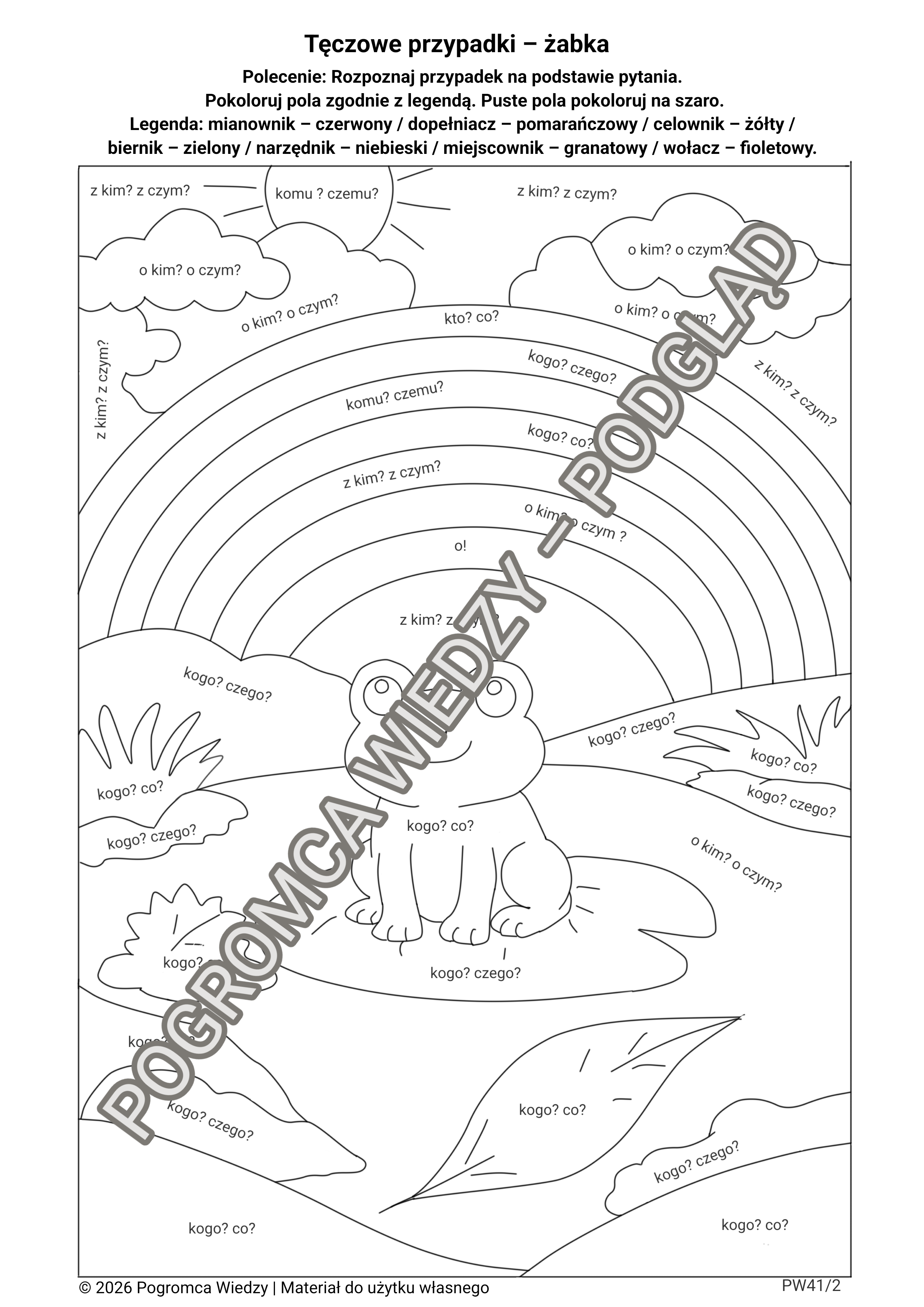 Zestaw 3 kart pracy utrwalających przypadki w atrakcyjnej, graficznej formie. Uczniowie rozpoznają przypadki na podstawie pytań i kolorują pola zgodnie z legendą, dzięki czemu ćwiczą w sposób angażujący i czytelny. Materiał sprawdzi się zarówno podczas lekcji, jak i do pracy samodzielnej. Karty można wykorzystać jako utrwalenie, powtórzenie lub sprawdzenie wiedzy. W zestawie znajduje się również klucz odpowiedzi ułatwiający szybkie sprawdzenie pracy uczniów.