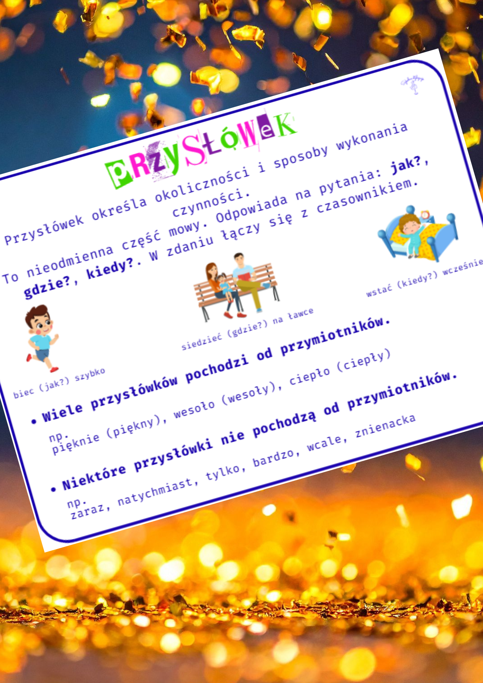 📘 Przysłówek — czyli ta część mowy, która zawsze wie jak, gdzie i kiedy… tylko uczniowie czasem jeszcze nie 😉