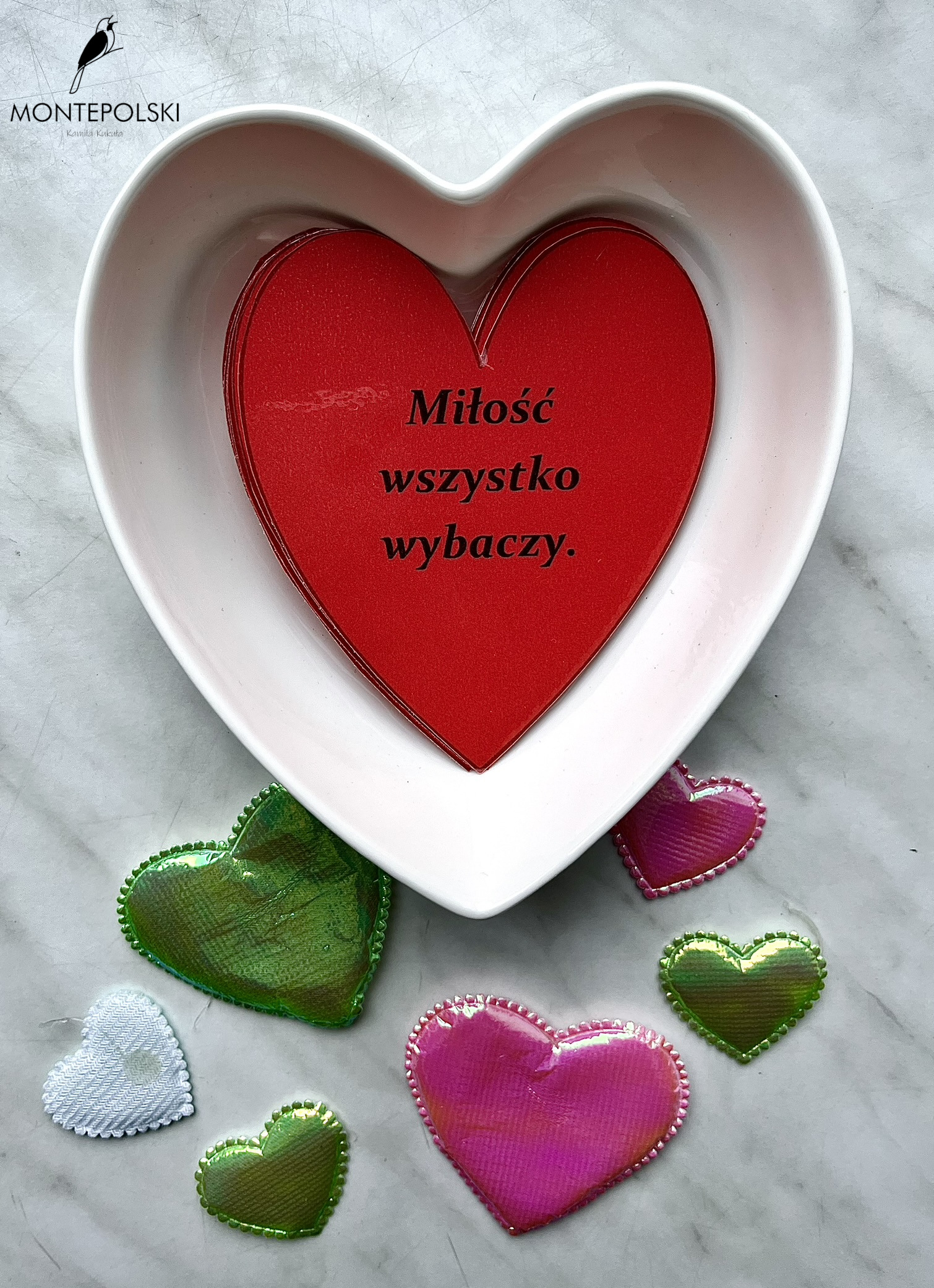 8 przysłów w formie graficznej (serduszka) związanych ze świętem zakochanych. Plus napis "WALENTYNKI".