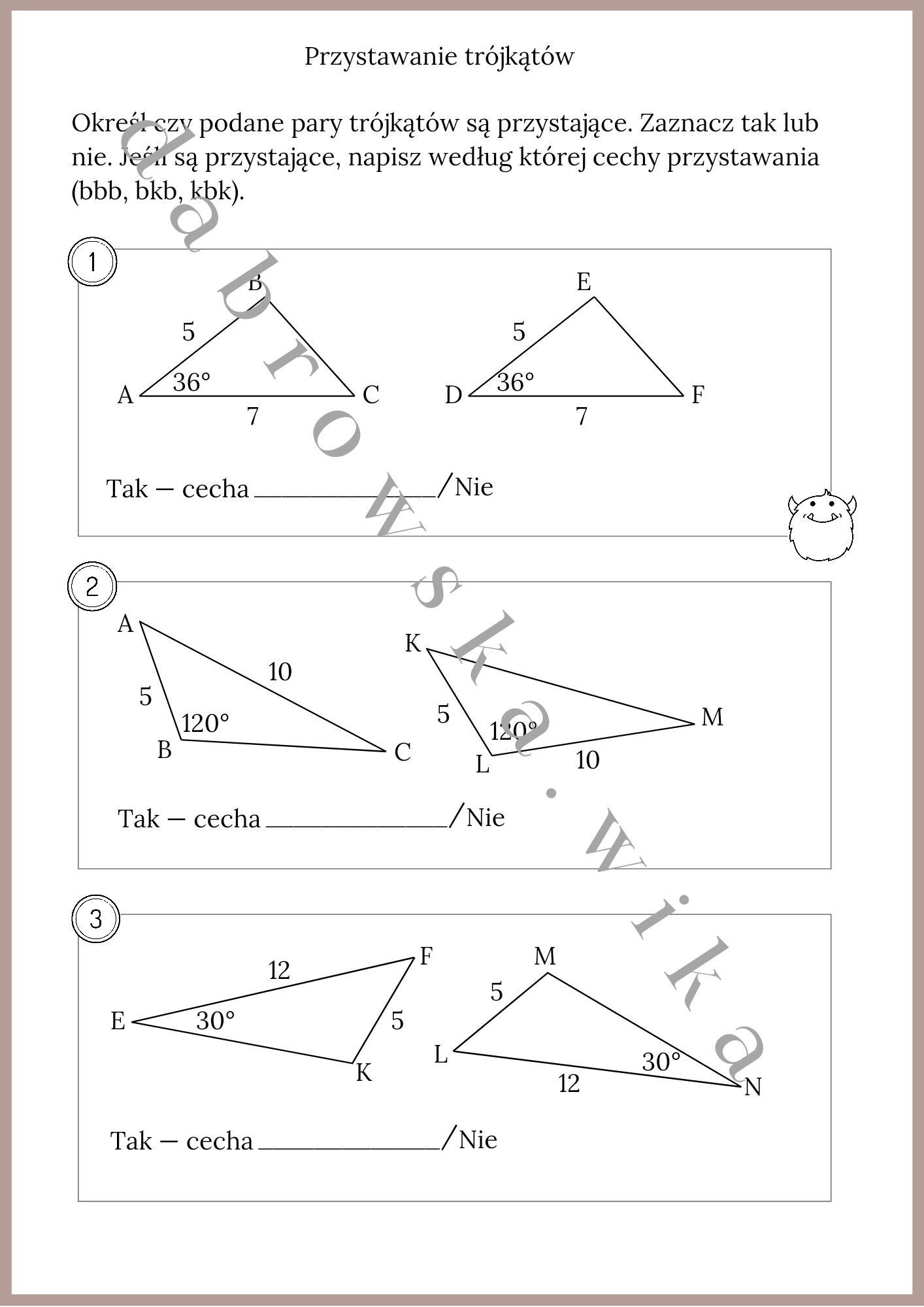 Zadaniem ucznia jest zaznaczenie, czy czy podane trójkąty są przystające, a jeśli tak, to według której cechy przystawania (bbb, bkb, kbk). W karcie pracy znaduje się 6 takich przykładów.