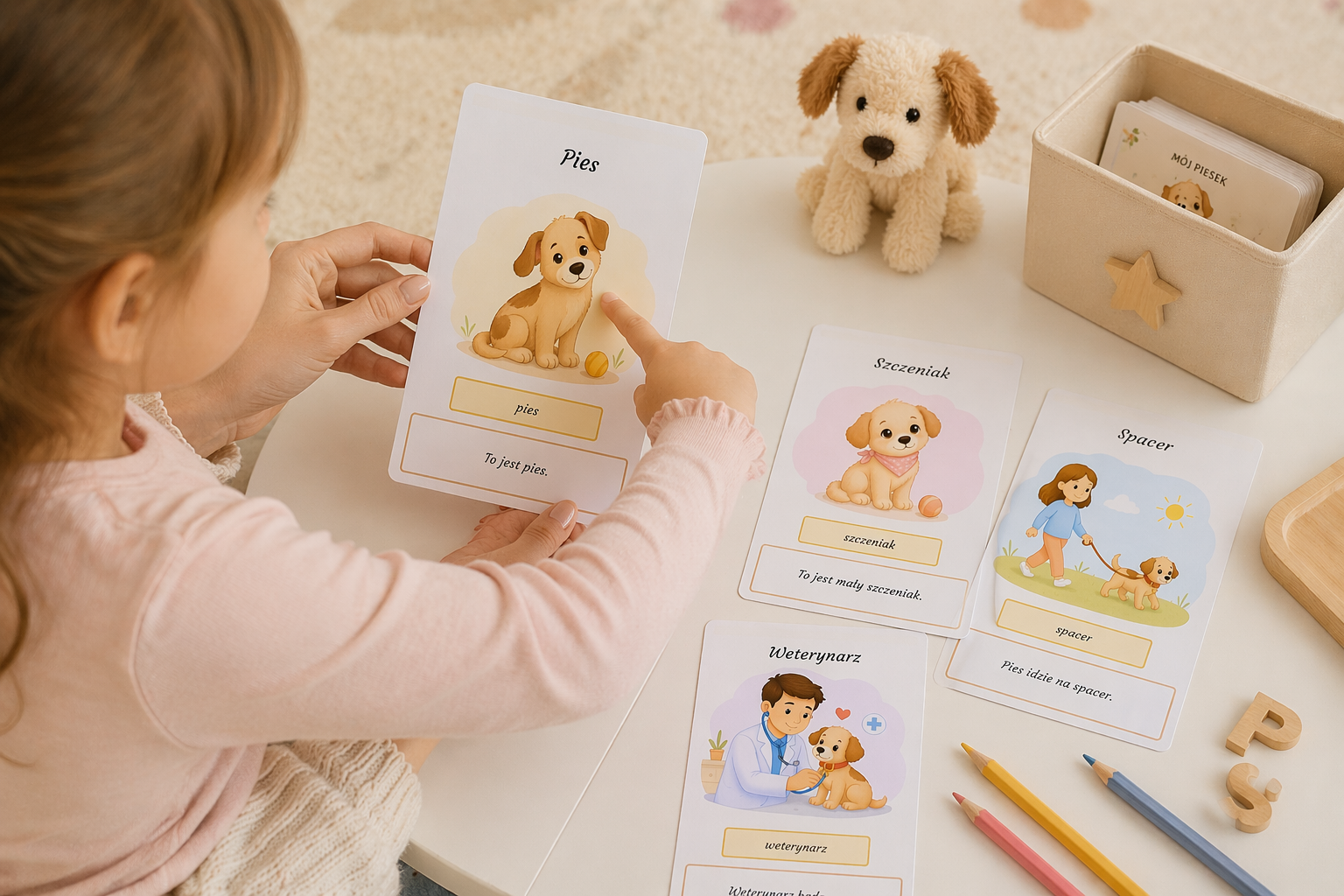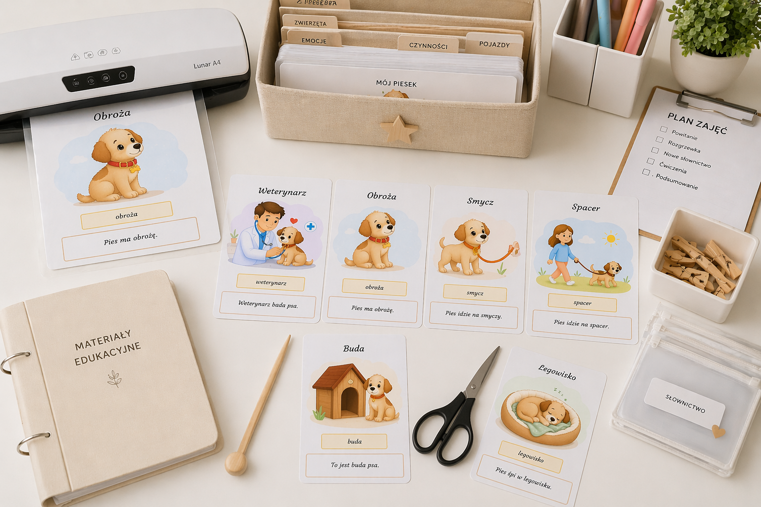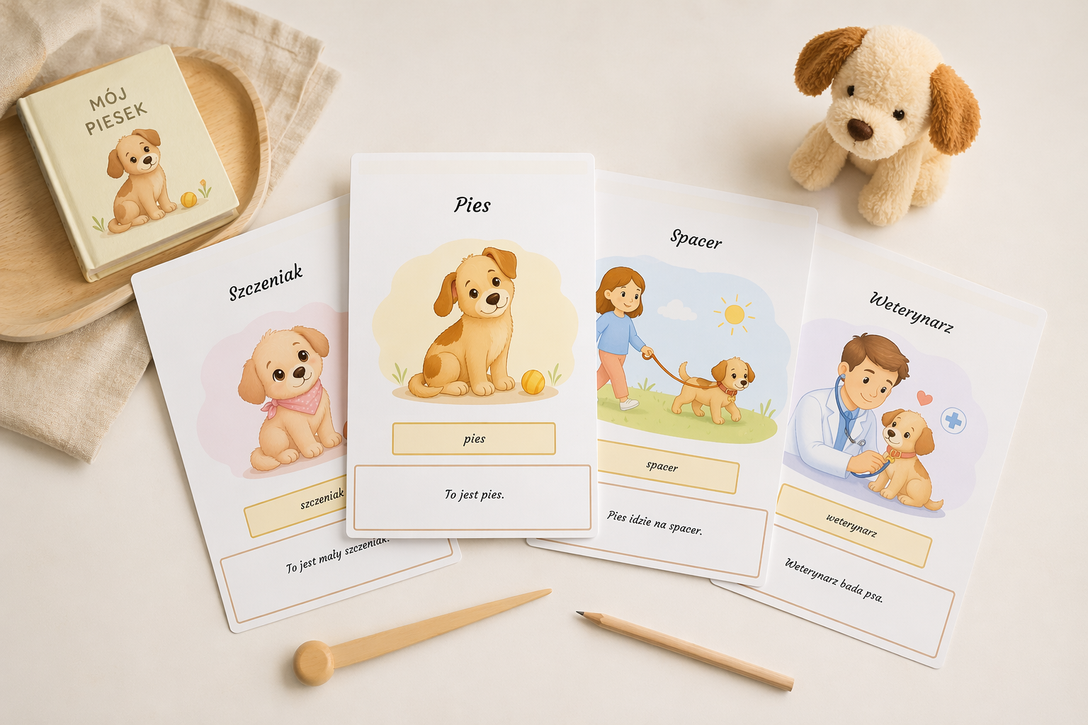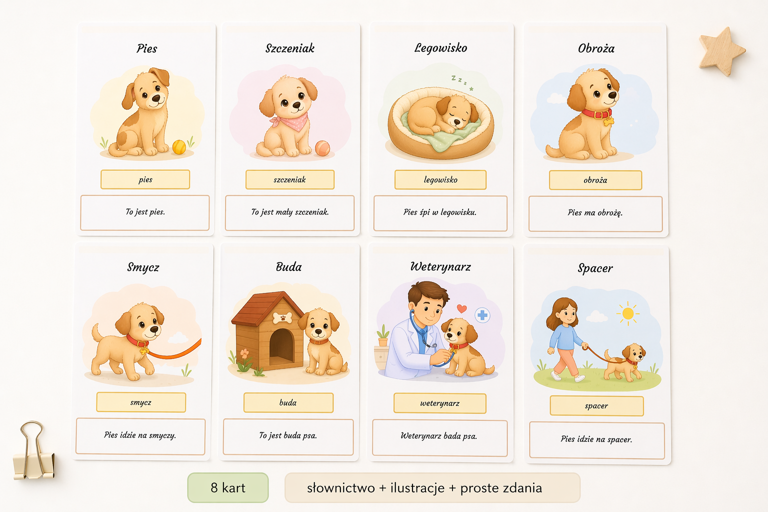 Stworzyłam prosty i estetyczny słownik obrazkowy dla dzieci, który wprowadza podstawowe słownictwo związane z psem 🐶✨. Każda karta zawiera czytelny podpis, ilustrację oraz krótkie zdanie, które pomaga dziecku zrozumieć znaczenie wyrazu i zobaczyć go w kontekście.