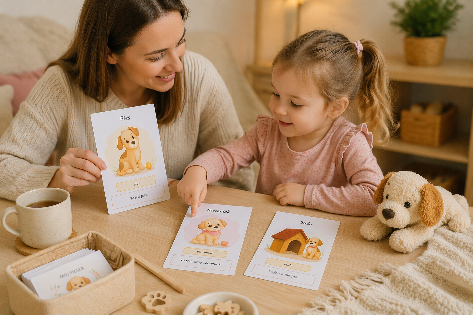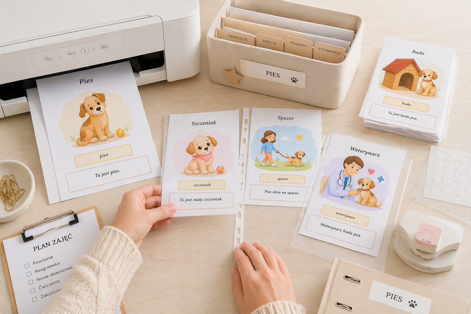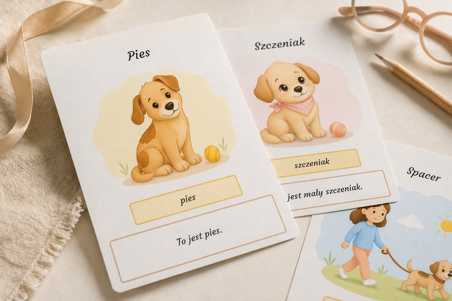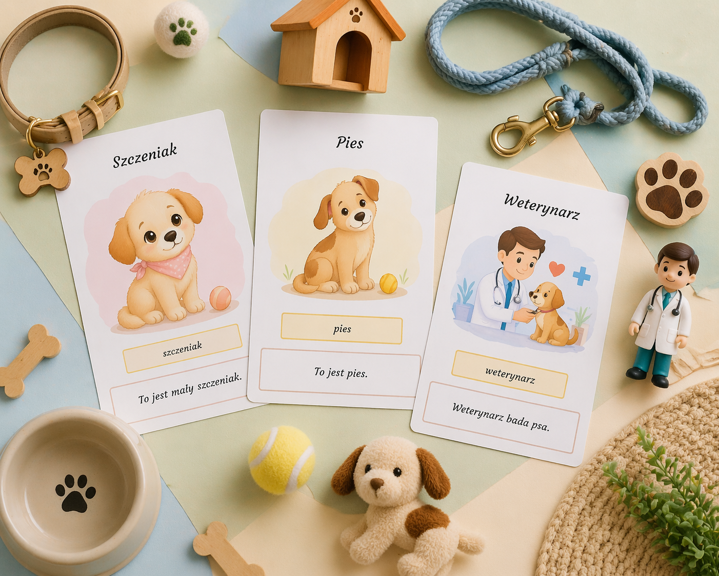 Stworzyłam prosty i estetyczny słownik obrazkowy dla dzieci, który wprowadza podstawowe słownictwo związane z psem 🐶✨. Każda karta zawiera czytelny podpis, ilustrację oraz krótkie zdanie, które pomaga dziecku zrozumieć znaczenie wyrazu i zobaczyć go w kontekście.