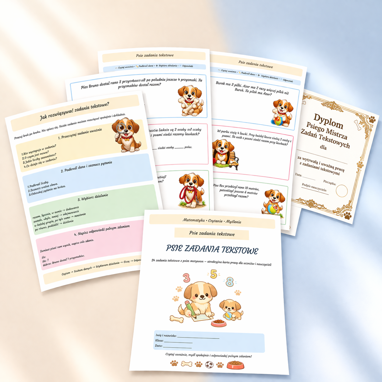 To nie są zwykłe karty pracy. To estetyczny, dopracowany i przyjazny dziecku zestaw, który oswaja zadania tekstowe dzięki sympatycznemu psiemu motywowi i przejrzystej formie. Dziecko nie tylko liczy, ale też uczy się myślenia krok po kroku.
