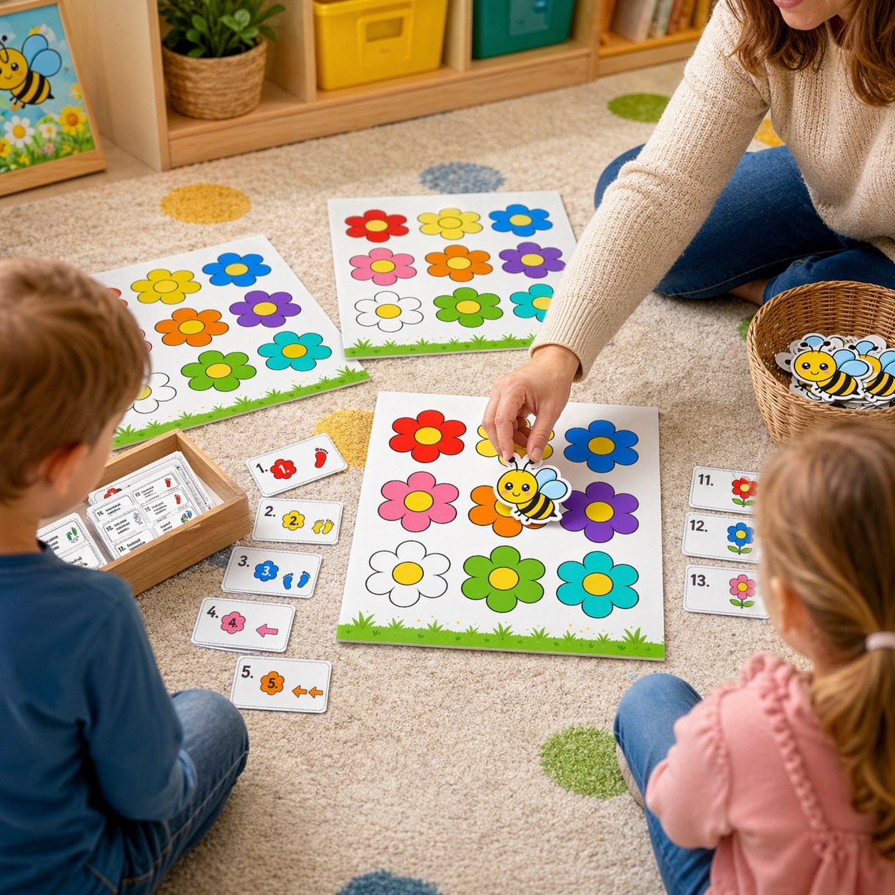 Przygotowałam kolorową grę dywanową „Pszczółka szuka kwiatka”, która świetnie sprawdzi się podczas zajęć z dziećmi w przedszkolu i edukacji wczesnoszkolnej. 🌸🐝