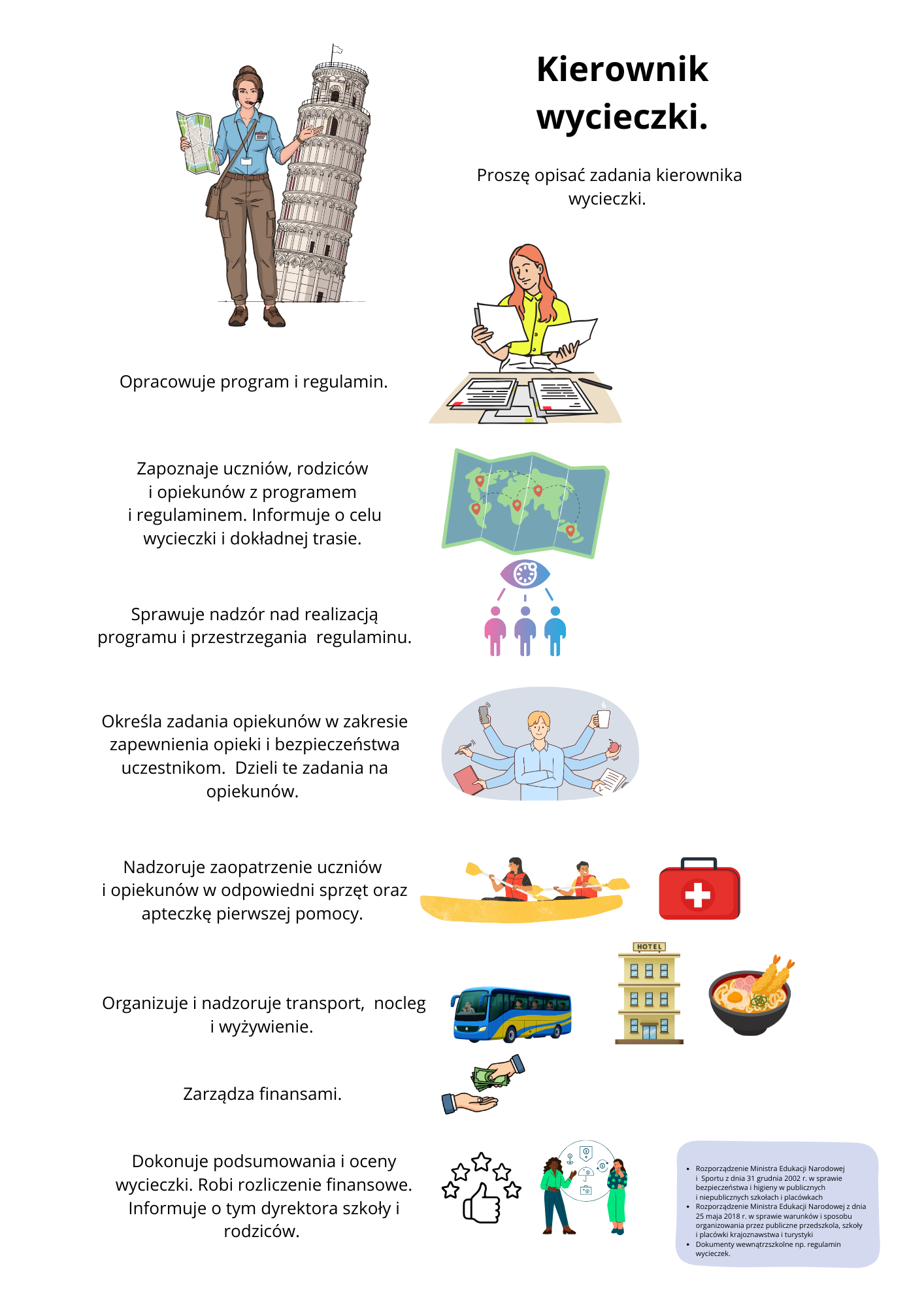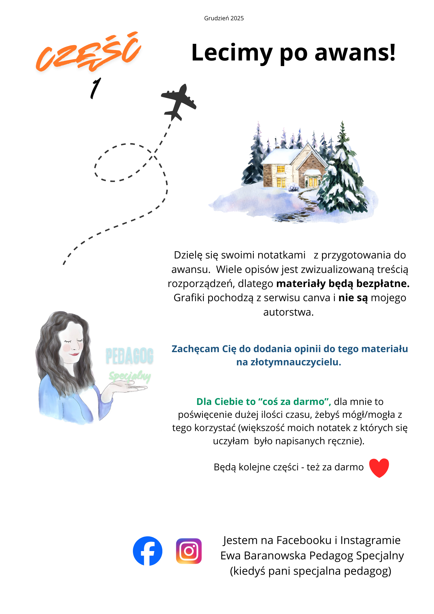 Pytania przygotowujące do awansu zawodowego. Dzień dobry. W tej ofercie znajdziecie Państwo moje własne notatki, z których uczyłam się do awansu zawodowego. Dzielę się nimi bezpłatnie! W części 1 znajdują się takie zagadnienia jak: - formy organizacji krajoznawstwa i turystyki - zadania kierownika wycieczki - zadania opiekuna wycieczki - wycieczka zagraniczna - ważne informacje z rozporządzenia o bezpieczeństwie i higienie (odnośnie wycieczek) - problemy cywilizacyjne i jak sobie z nimi radzić - polecane strony edukacyjne - samoocena/ ewaluacja własnej pracy - do szkoły wpływa orzeczenie – procedura - wypadek na wycieczce – procedura - ewakuacja w szkole w trakcie lekcji – procedura - cechy pedagoga specjalnego. Awans zawodowy nauczyciela. Pytania do awansu zawodowego. Mianowanie. Dyplomowanie.