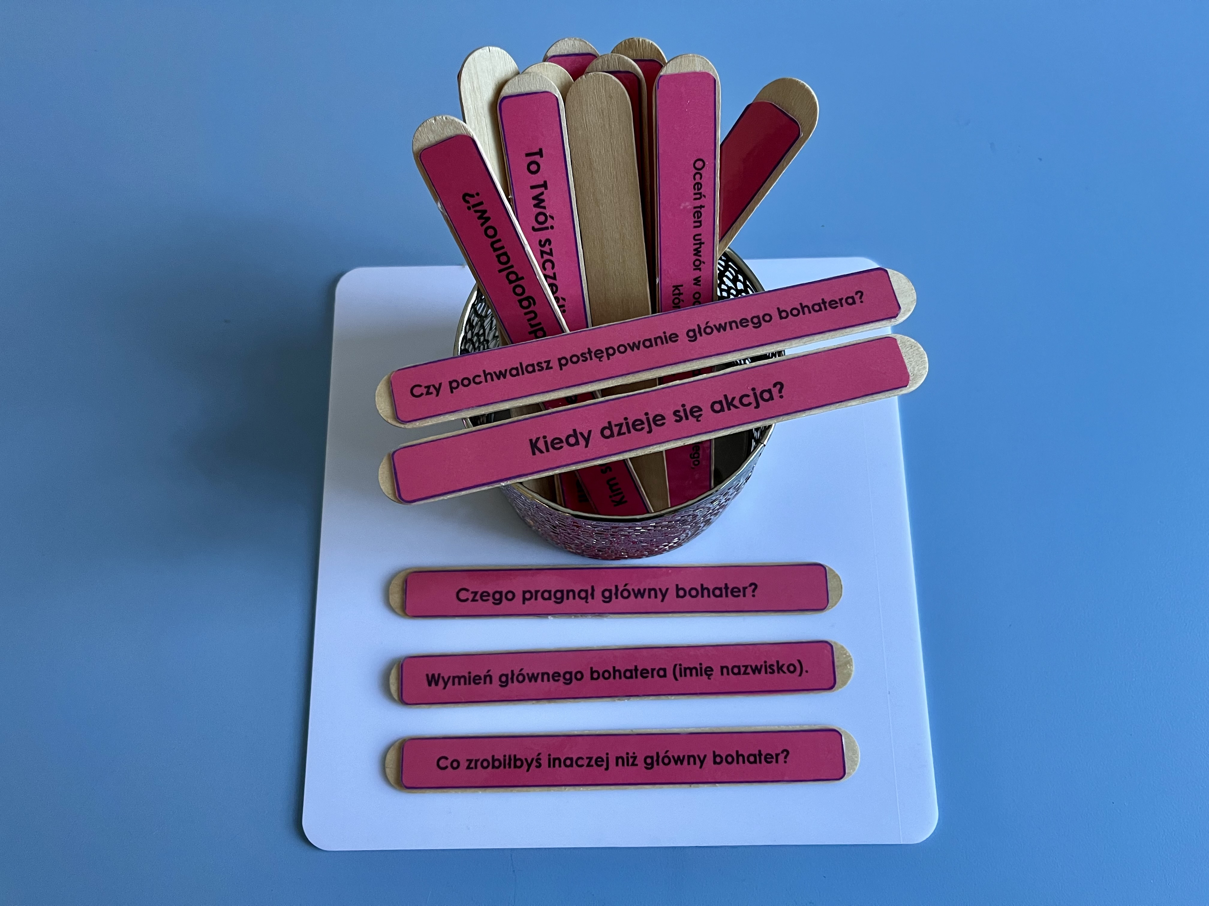Pytania w poziomej formie, ja je przykleiłam do patyczków laryngologicznych. Możemy używać ich na każdym poziomie nauczania, myślę, że od 5-6 klasy wzwyż. Pytania pozwolą doskonale zorientować się, kto zapoznał się z treścią lektury. Można je także wykorzystać powtórkowo w klasie 8, przed egzaminem ósmoklasisty - uczeń losuje tytuł lektury i później odpowiada na pytania z patyczków (przypominamy sobie wówczas treść utworów).