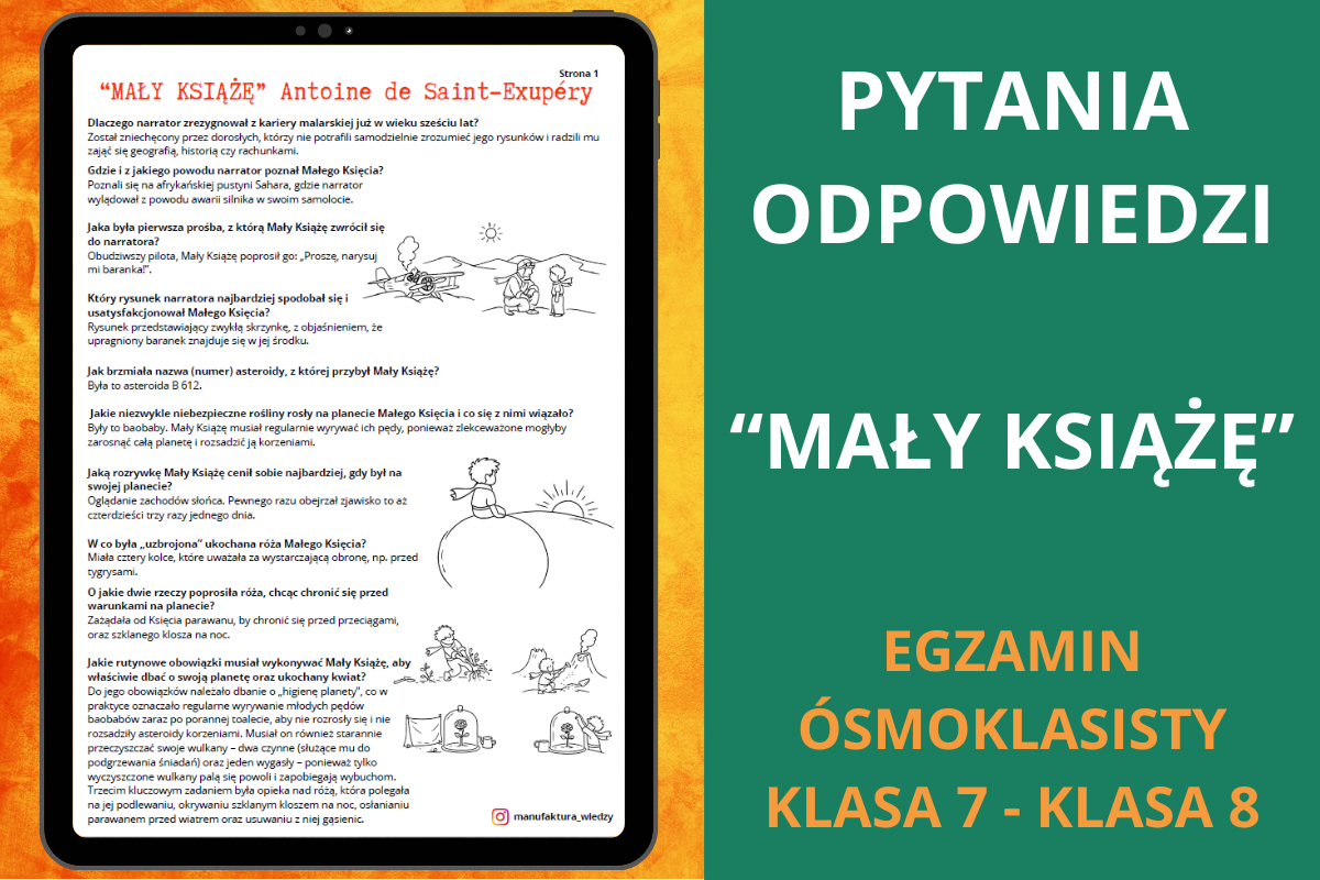 Poniżej znajdziesz zestaw pytań i odpowiedzi do lektury Mały Książę Antoine’a de Saint-Exupéry’ego, przygotowany jako szybka i skuteczna forma powtórki z języka polskiego.