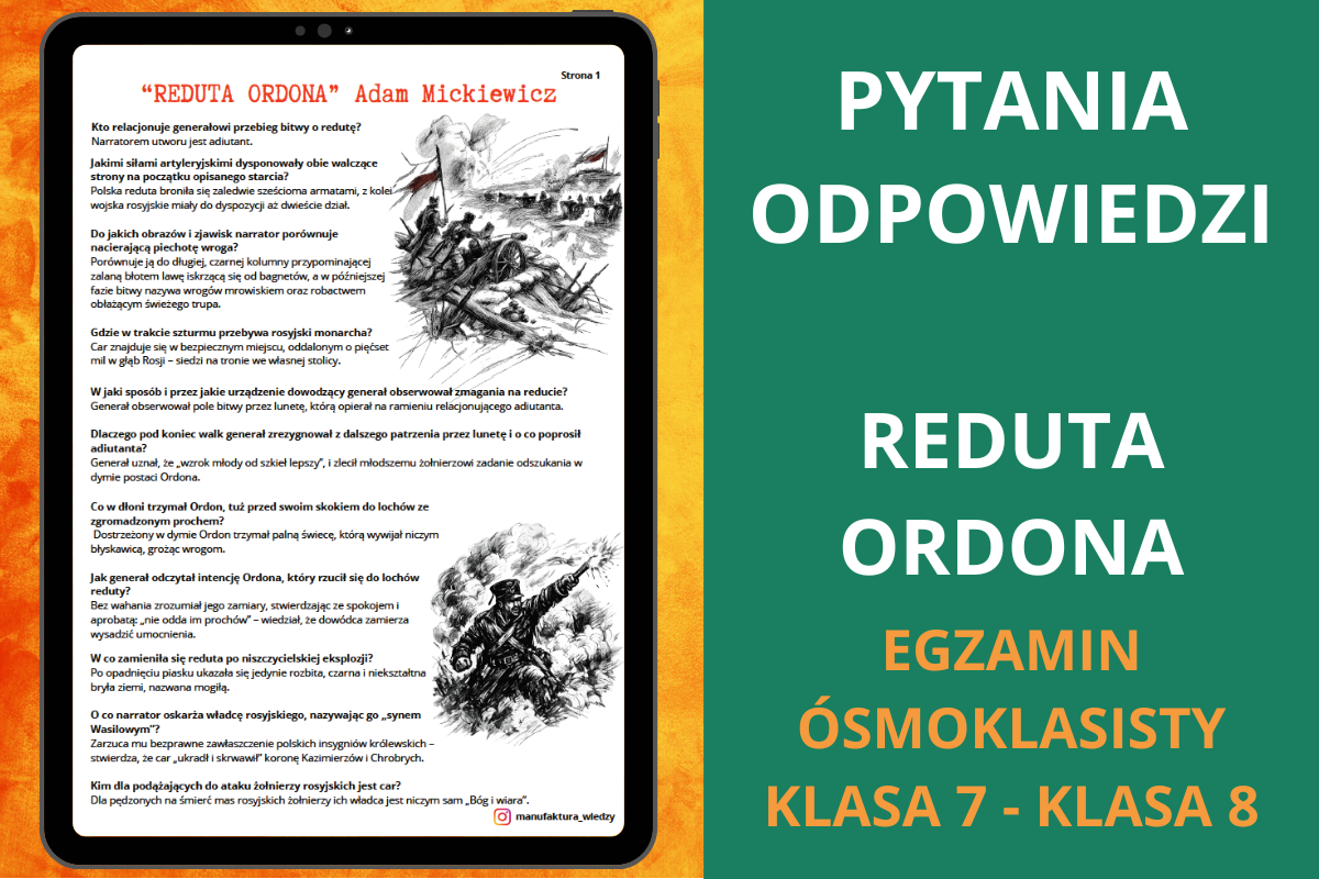 Poniżej znajdziesz zestaw pytań i odpowiedzi do utworu Reduta Ordona Adama Mickiewicza, przygotowany jako szybka i skuteczna forma powtórki z języka polskiego.