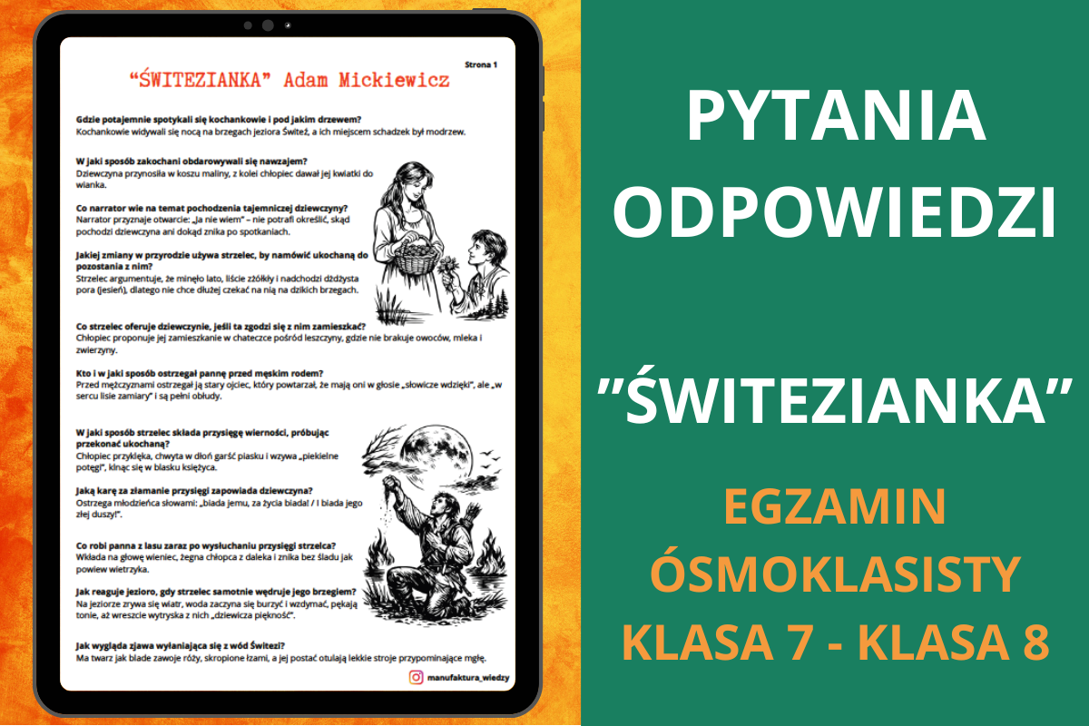 Znajdziesz tutaj zestaw pytań i odpowiedzi do ballady Świtezianka Adama Mickiewicza, przygotowany jako szybka i skuteczna forma powtórki z języka polskiego.