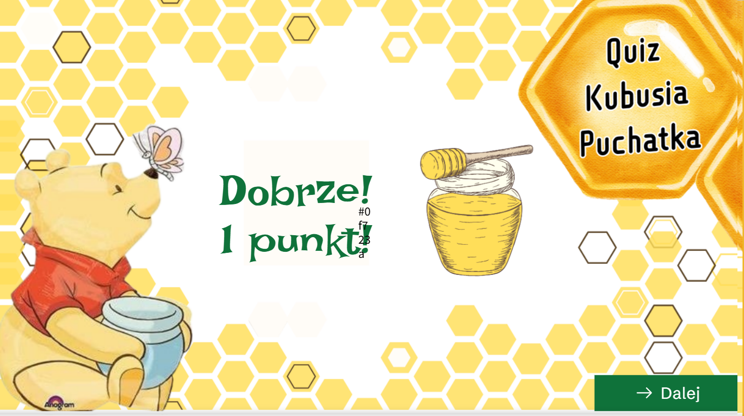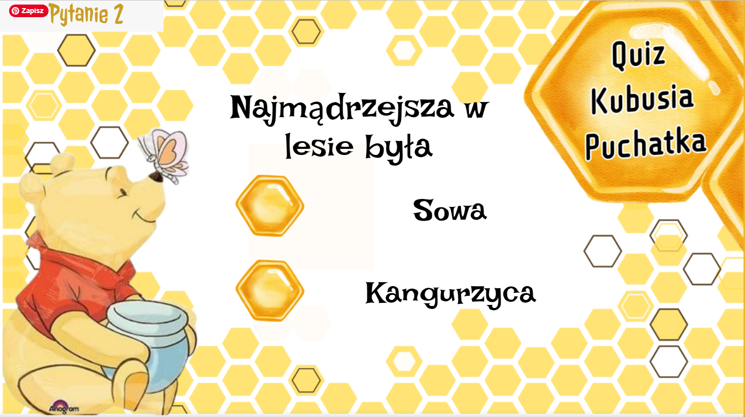 Quiz z 32 pytaniami z książki oraz bajki "Kubuś Puchatek". Wykonany w aplikacji Genial.ly.