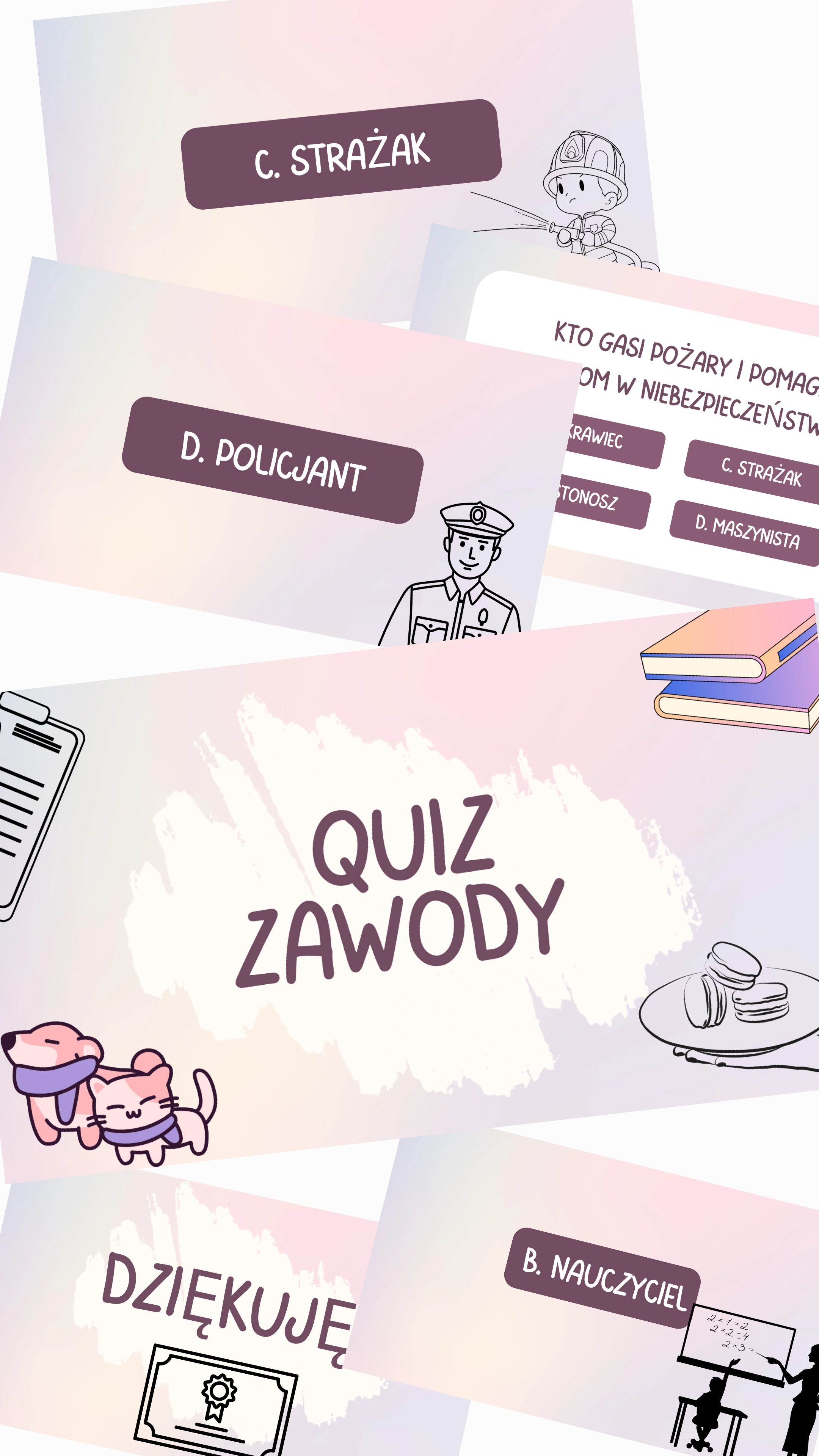Quiz o tematyce Zawody dla dzieci. Obejmuje 8 zawodów, posiada odpowiedźi, ma 18 stron