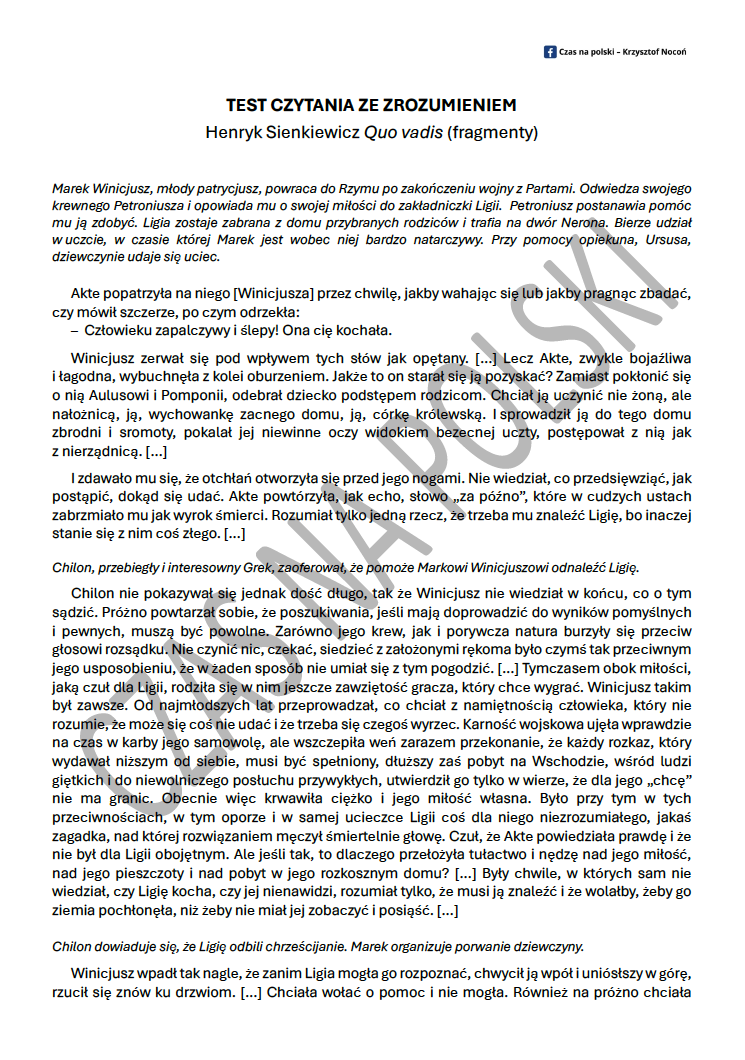 1. Wybrane fragmenty powieści „Quo vadis”, dobrane tak, aby przedstawiały przemianę Marka Winicjusza. (2 strony)