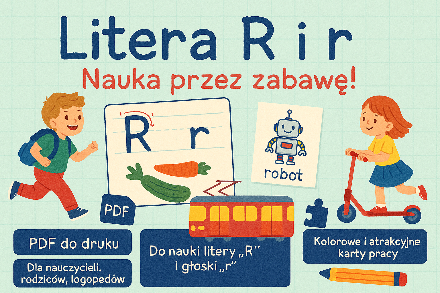 Zestaw edukacyjny stworzony z myślą o najmłodszych uczniach 🧒👧, którzy uczą się rozpoznawać, pisać i słyszeć głoskę oraz literę „R” i „r”. Idealny do wykorzystania na zajęciach w klasie, podczas terapii logopedycznej 🗣️ lub w domu jako urozmaicenie nauki poprzez zabawę! 🎉