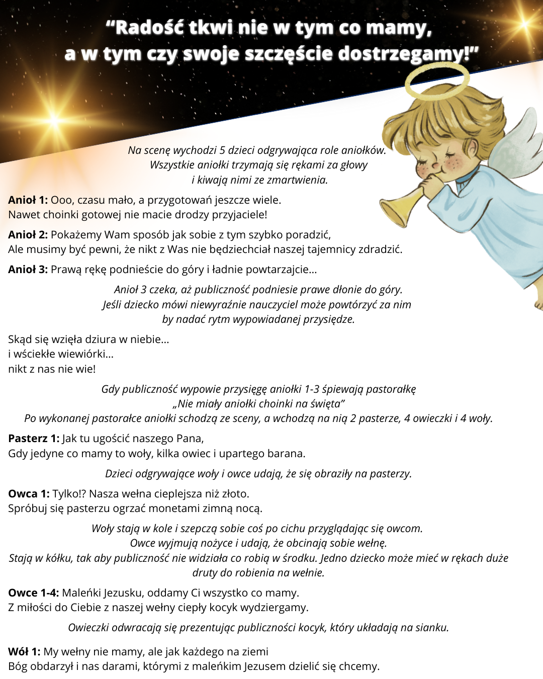 Scenariusz rymowanych, tradycyjnych jasełek, które łączą humor z ważnym przesłaniem i angażują publiczność we wspólne przeżywanie przedstawienia i śpiewanie pastorałek.