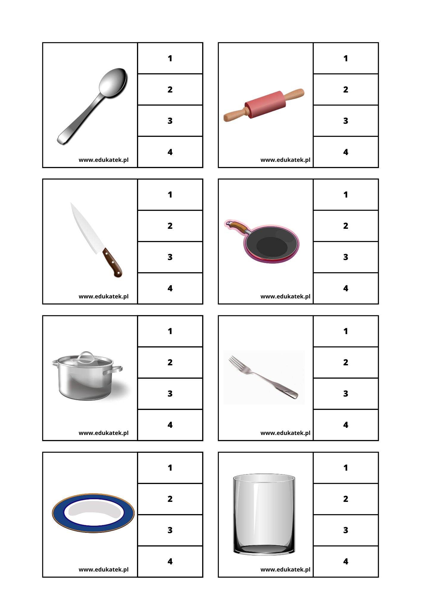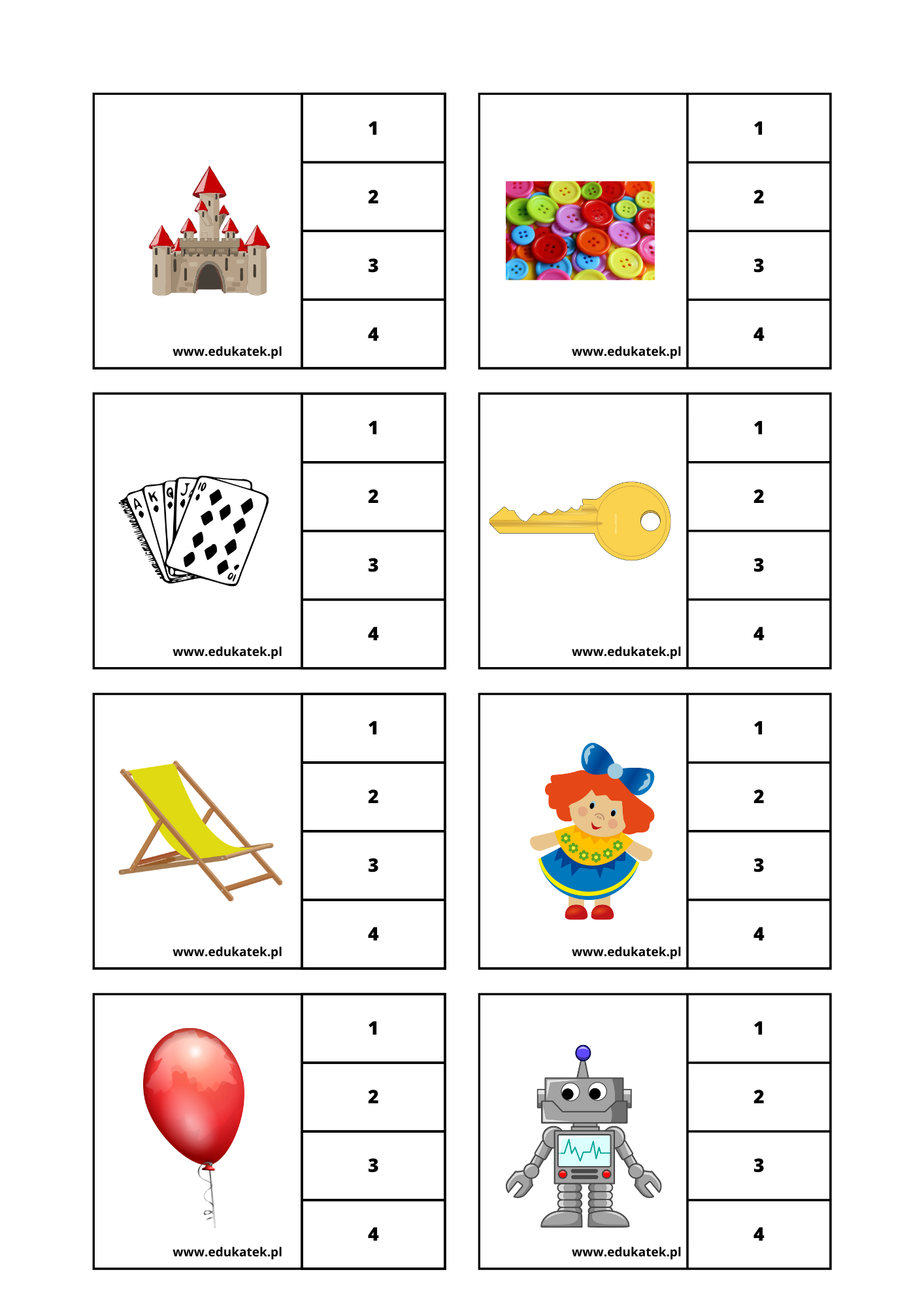 Dzieci losują karty zgodnie z ruchem wskazówek zegara. Nazywają to, co widzą na obrazku, a następnie przypinają klamerkę przy właściwej cyfrze.