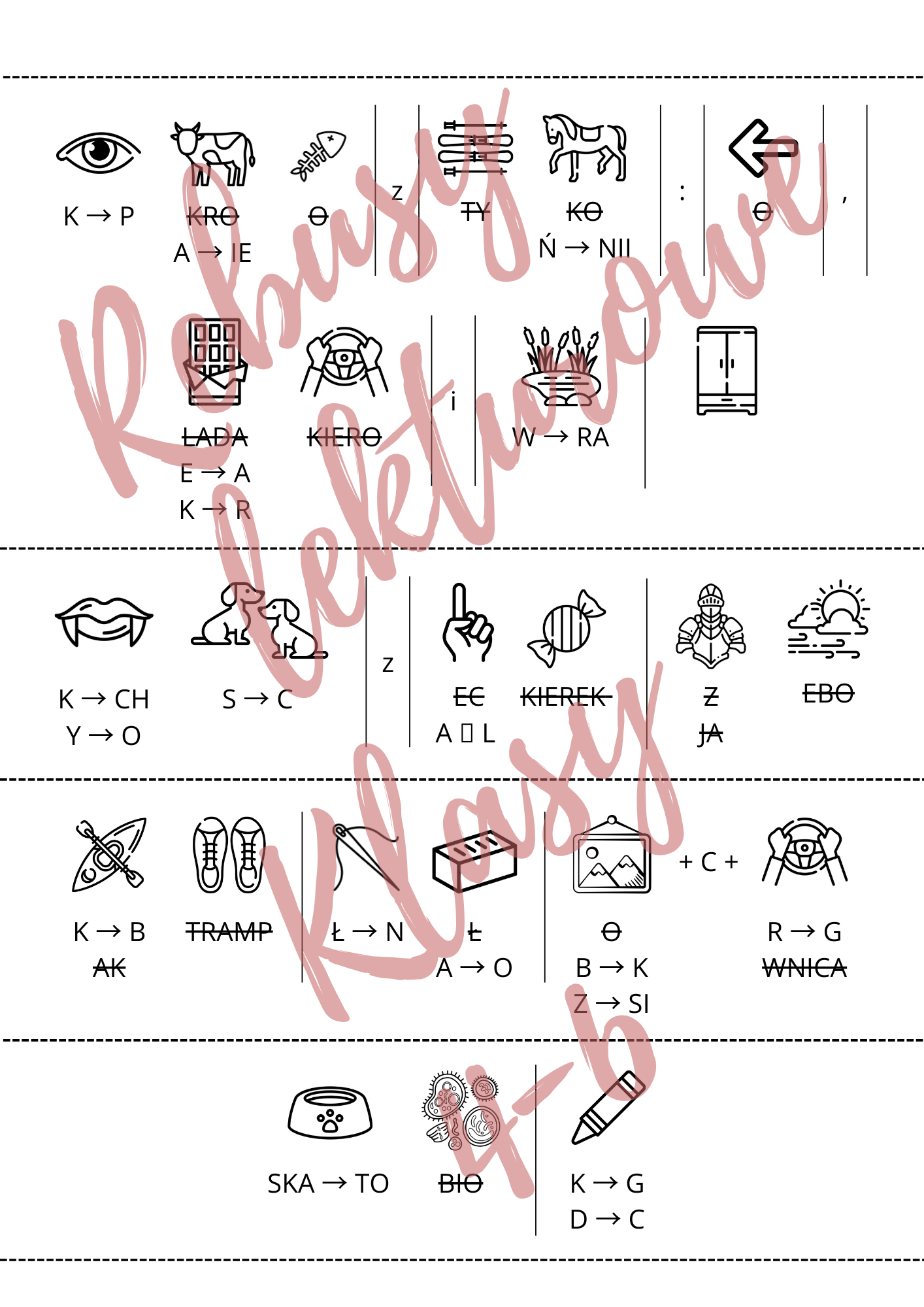 Oferuję rebusy lekturowe dla klas 4-6 (bez przydziału do poszczególnych klas - możliwość rozcięcia rebusów i dostosowania ich do swoich potrzeb).