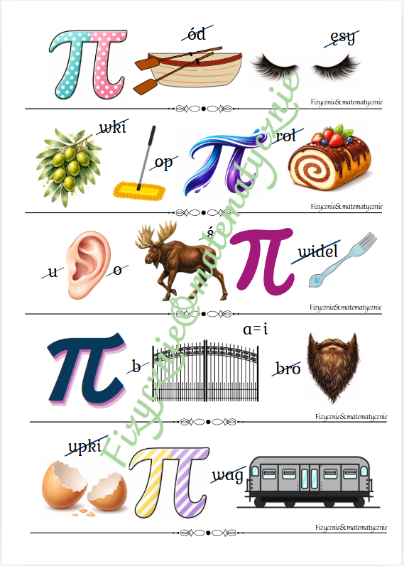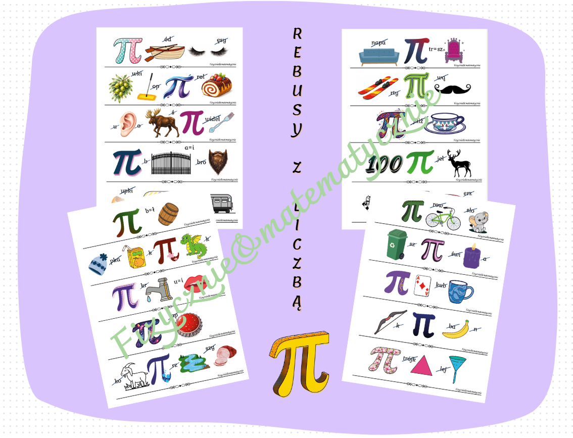 Materiał zawiera 20 nowych, autorskich rebusów z liczbą π w roli głównej, opracowanych na 4 stronach formatu A4. Każdy rebus został zaprojektowany od podstaw – od doboru hasła, przez analizę językową, po ilustrację – tak, aby był czytelny, jednoznaczny i dostosowany do możliwości uczniów.