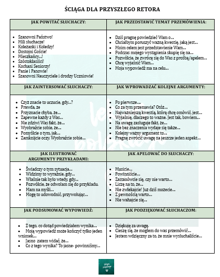 Materiał przeznaczony jest dla uczniów klas 7-8 . Pomaga ćwiczyć redagowanie przemówienia- formy wypowiedzi obowiązującej od 2025 roku podczas egzaminu ósmoklasisty.
