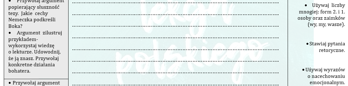 Materiał zawiera zadania, które pozwolą uczniom młodszych klas oswoić się z formą przemówienia. Uczeń pracuje metodą kolejnych kroków- wychodząc od obserwacji gotowego tekstu, stopniowo zdobywa umiejętności w redagowaniu tekstu samodzielnego. Pracuje z kartami, które zawierają na marginesie liczne wskazówki i podpowiedzi. Na poziomie klasy czwartej/piątej oczekujemy od ucznia zapoznania się z formą i tworzenia prostych tekstów w oparciu o wzory a nadawcą przemówienia czynimy znanych uczniowi bohaterów literackich. Na kolejnym poziomie (klasa piąta/szósta) rozbudowujemy tekst i precyzyjniej nazywamy użyte środki retoryczne, by uczeń mógł świadomie po nie sięgać. W klasie szóstej/siódmej przychodzi czas na zastąpienie nadawcy przemówienia- wówczas czynimy nim ucznia a jego argumentacja ma dotyczyć nie tylko jednej, wskazanej, ale dwóch poznanych lektur. Po takim stopniowym oswajaniu z formą wypowiedzi, przemówienie nie powinno sprawiać uczniowi sporego problemu podczas egzaminu.