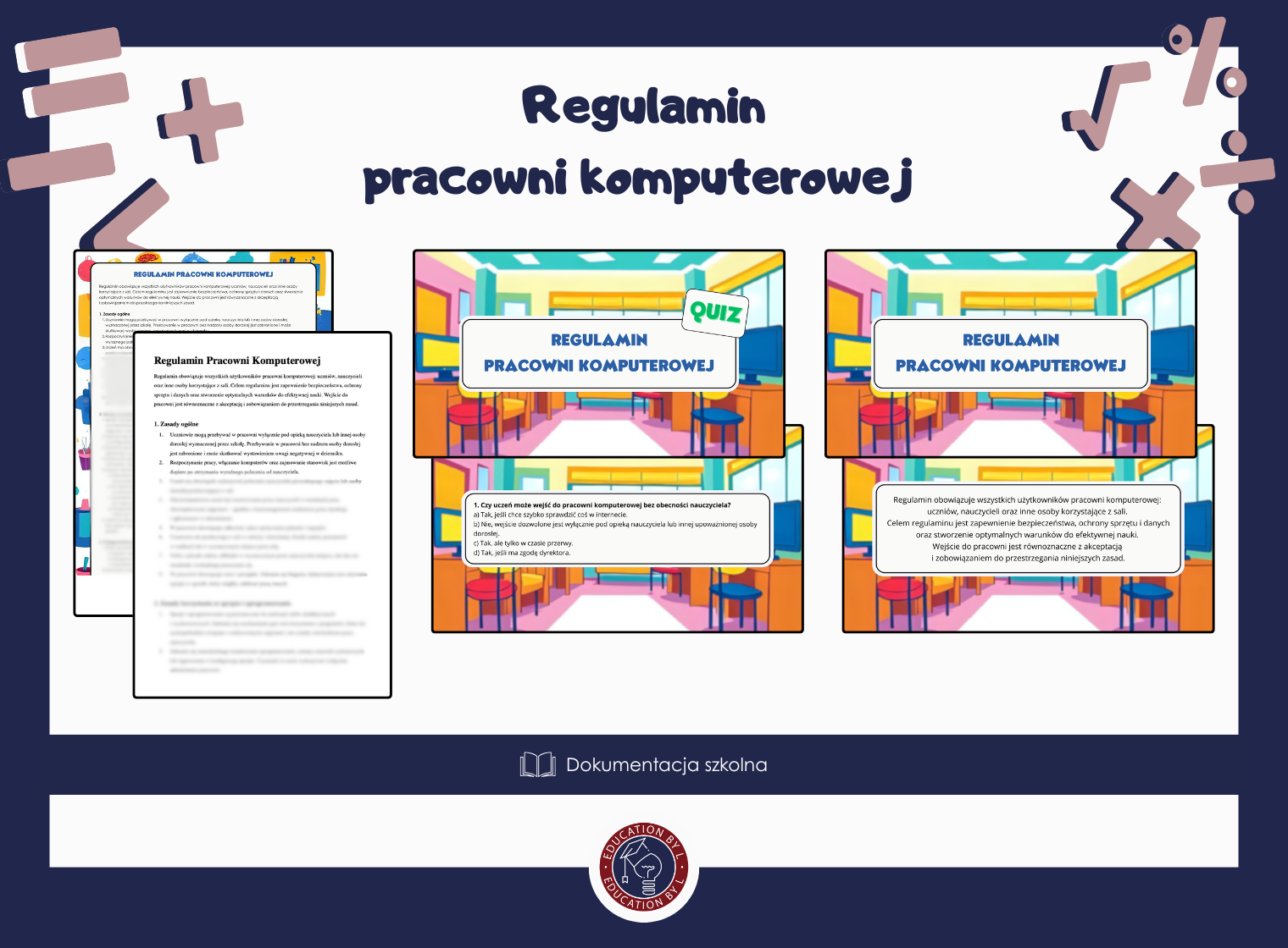 Wiem, jak ważne jest, aby uczniowie przestrzegali zasad podczas pracy z komputerami. Jednak wprowadzenie regulaminu w sposób, który jest zrozumiały i angażujący, bywa trudne. Ten kompleksowy zestaw to Twoje gotowe narzędzie, które pozwoli Ci w przystępny sposób przedstawić wszystkie zasady, upewnić się, że uczniowie je znają, a jednocześnie stworzyć bezpieczne środowisko do nauki.