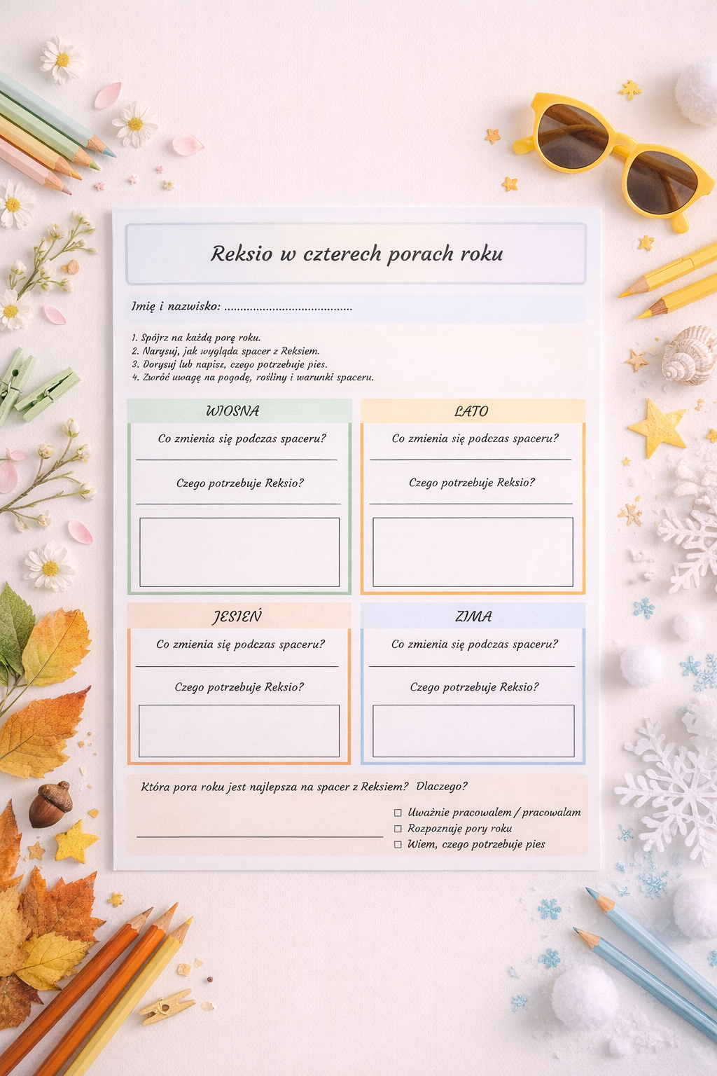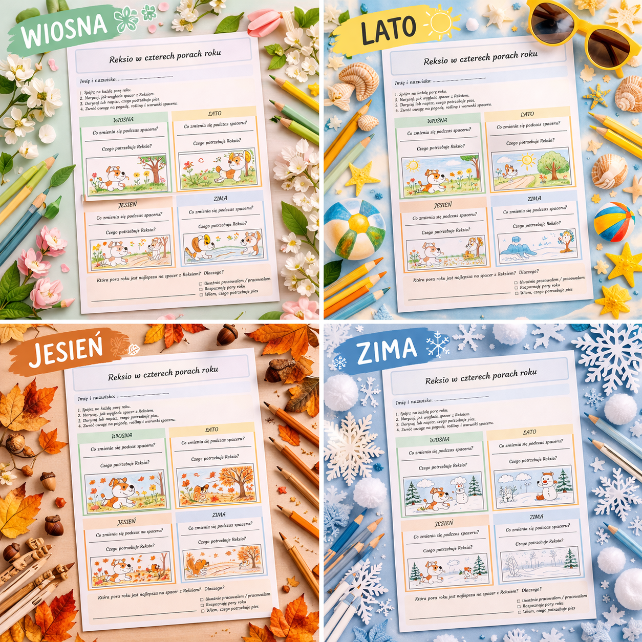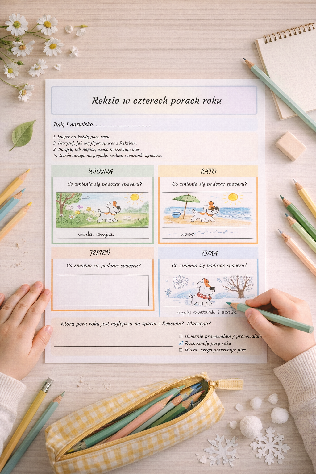 To nie jest zwykła karta pracy. To mini przygoda edukacyjna z Reksiem, która prowadzi dziecko przez cztery pory roku i pozwala mu… myśleć, rysować i odkrywać świat 🐶✨