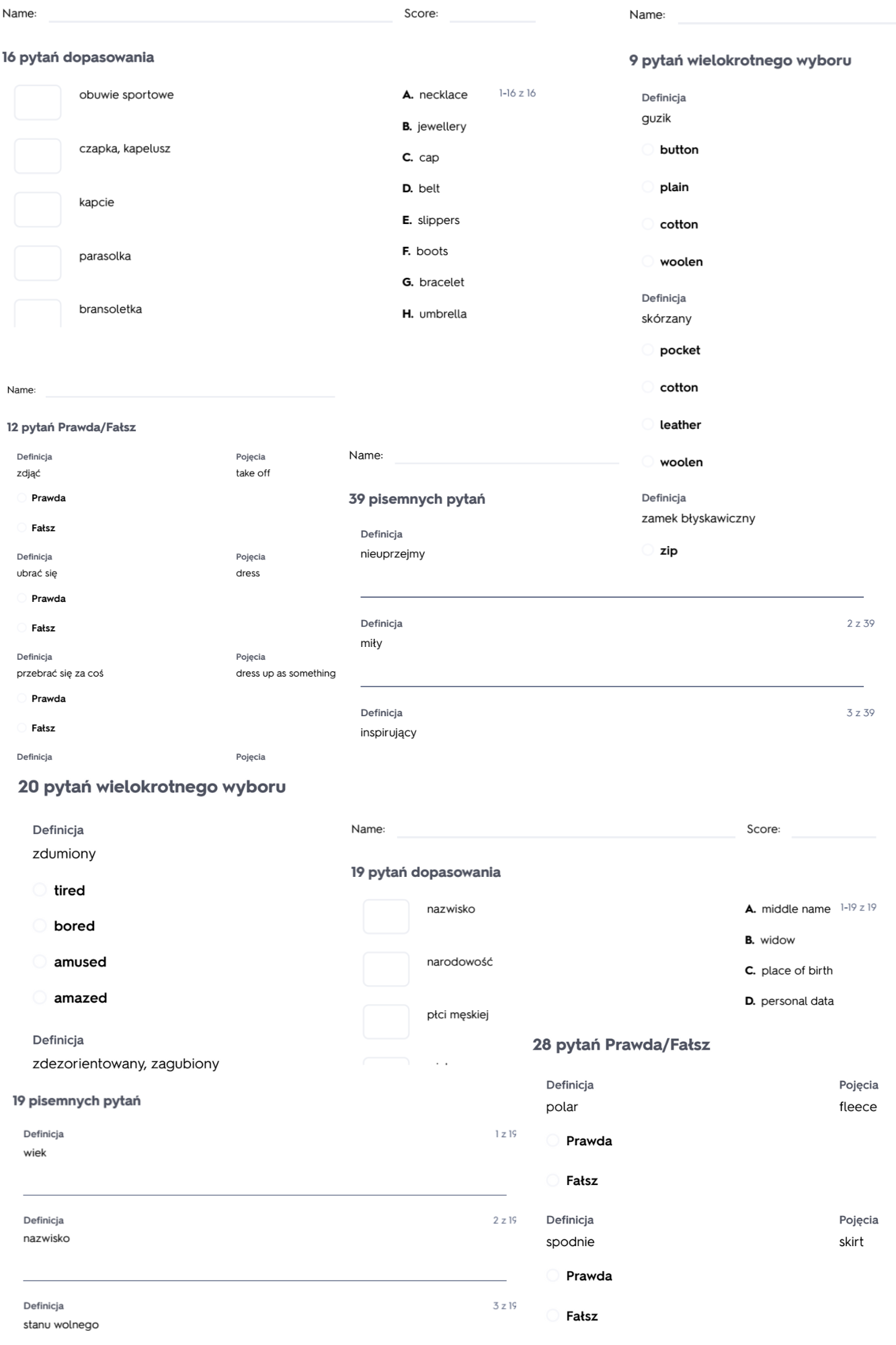 Testy celowo zostały stworzone w wersji czarno-białej bez zbędnych grafik. Dzięki temu zaoszczędzisz na tuszu, a same testy prezentują się schludnie i przejrzyście.