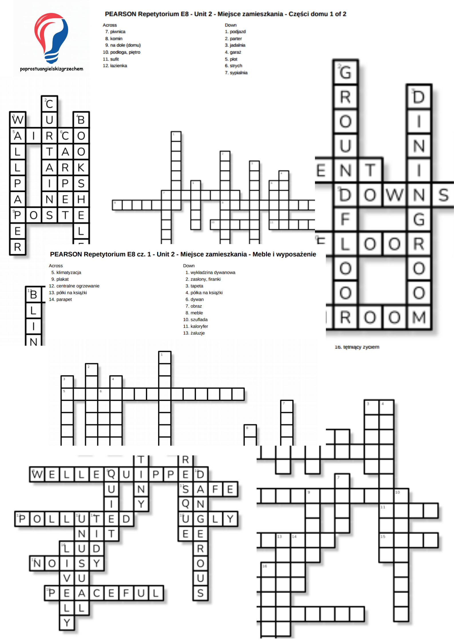 Zestaw zawiera 13 krzyżówek obejmujących słówka z działu drugiego (miejsca zamieszkania) do podręcznika Repetytorium dla szkoły podstawowej cz. 1 (Pearson). Zestaw zadań na powtórkę słownictwa z tego działu znajdziesz tutaj, a kartę pracy tutaj:
