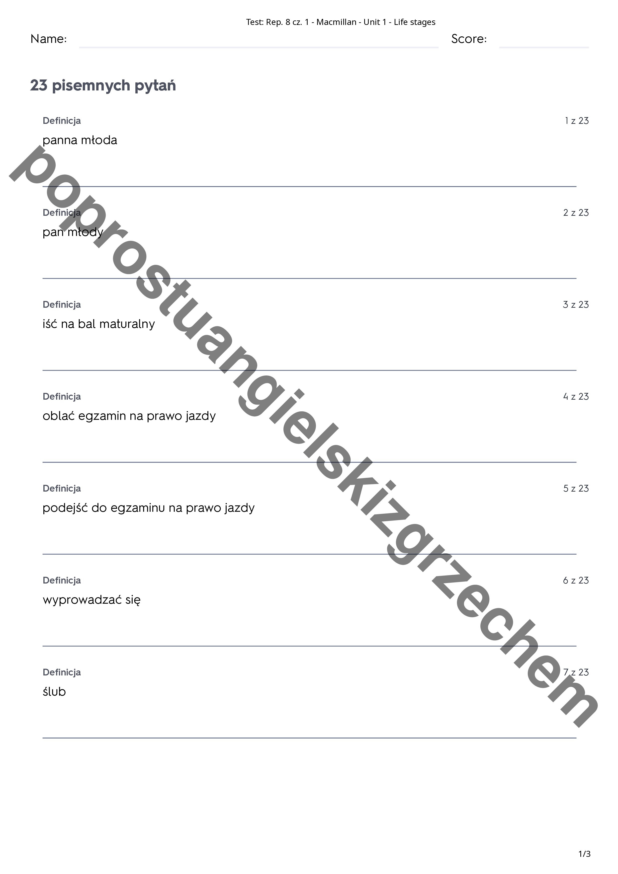 Nie możesz znaleźć dodatkowych materiałów do danego podręcznika? Nie masz czasu na tworzenie testów z danego działu? Zaoszczędź sobie kłopotu i poświęć swoją energię na nauczanie, a nie na przygotowania do lekcji. Słówka prosto z podręcznika Zestaw zawiera 156 słówek z działu pierwszego do podręcznika Repetytorium Ósmoklasisty cz. 1 (Macmillan). Testy podzielone są na 10 podrozdziałów, a każdy z nich na 4 kategorie zadań (prawda/fałsz, dopasuj, wielokrotny wybór, pisemny) Dopasuj dla każdego Każdy rodzaj testu charakteryzuje się innym poziomem trudności, co pozwoli Ci dopasować go do umiejętności Twojego ucznia. Oczywiście możesz też dowolnie mieszać części różnych testów między sobą. Zaoszczędź pieniądze na drukowaniu Testy celowo zostały stworzone w wersji czarno-białej bez zbędnych grafik. Dzięki temu zaoszczędzisz na tuszu, a same testy prezentują się schludnie i przejrzyście. Co dostajesz? Za jedyne 0,20 zł za słówko (w czterech wersjach różnych rodzajów testów) zyskujesz czas i spokojną głowę. A Twoi uczniowie uczą się słownictwa zgodnie z danym podręcznikiem. Płacisz raz, a materiał służy Ci na wielu lekcjach, z różnymi uczniami, przez wiele lat.