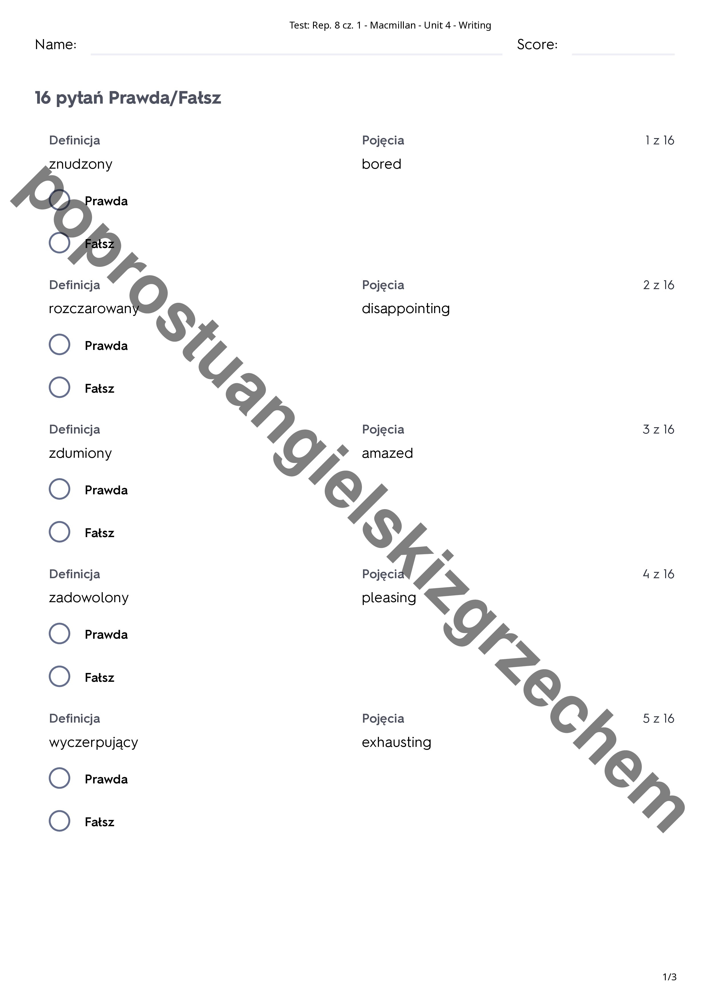 Zestaw zawiera 118 słówek z działu czwartego do podręcznika Repetytorium Ósmoklasisty cz. 1 (Macmillan). Testy podzielone są na 5 podrozdziałów, a każdy z nich na 4 kategorie zadań (prawda/fałsz, dopasuj, wielokrotny wybór, pisemny)