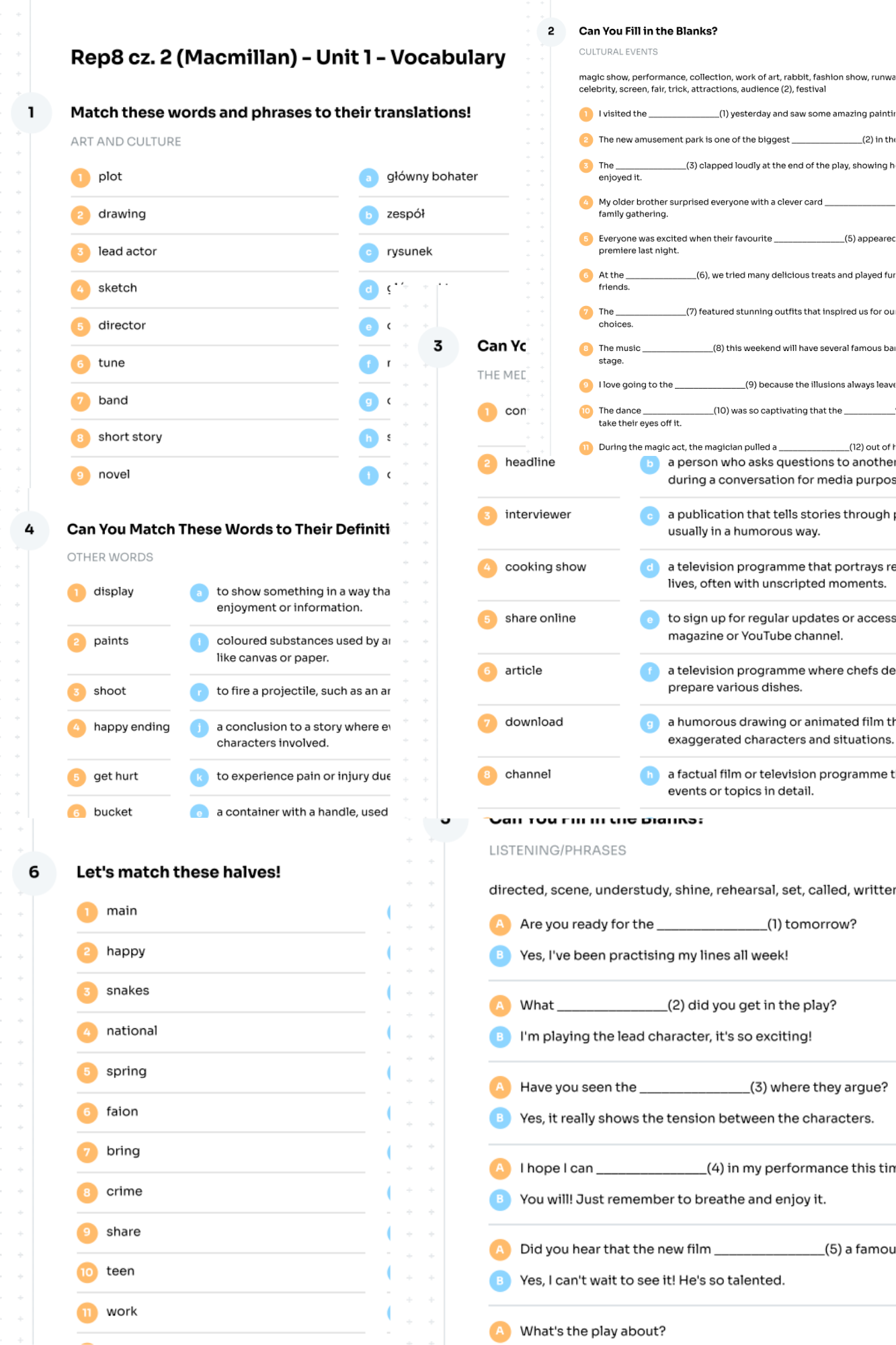 Słownictwo jest pogrupowane według nagłówków w sekcji Vocabulary działu dziewiątego, a każde zadanie jest na osobnej kartce.