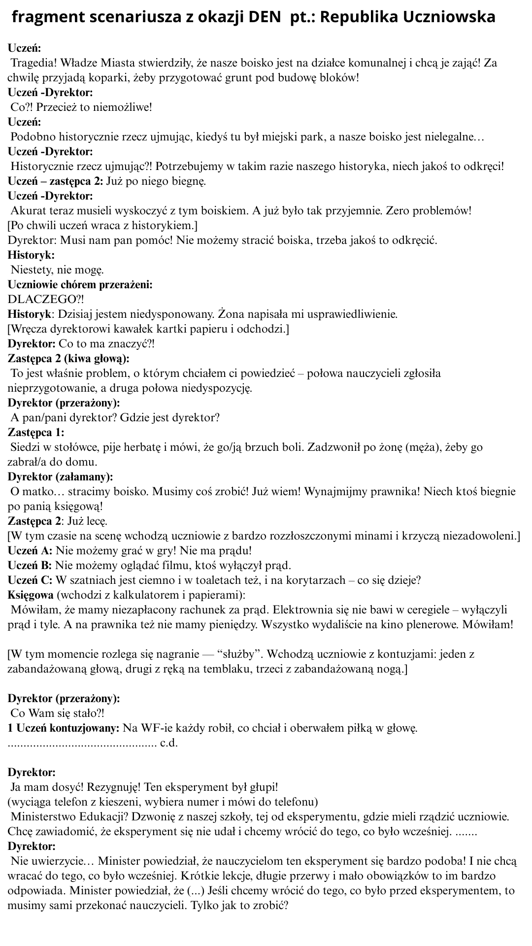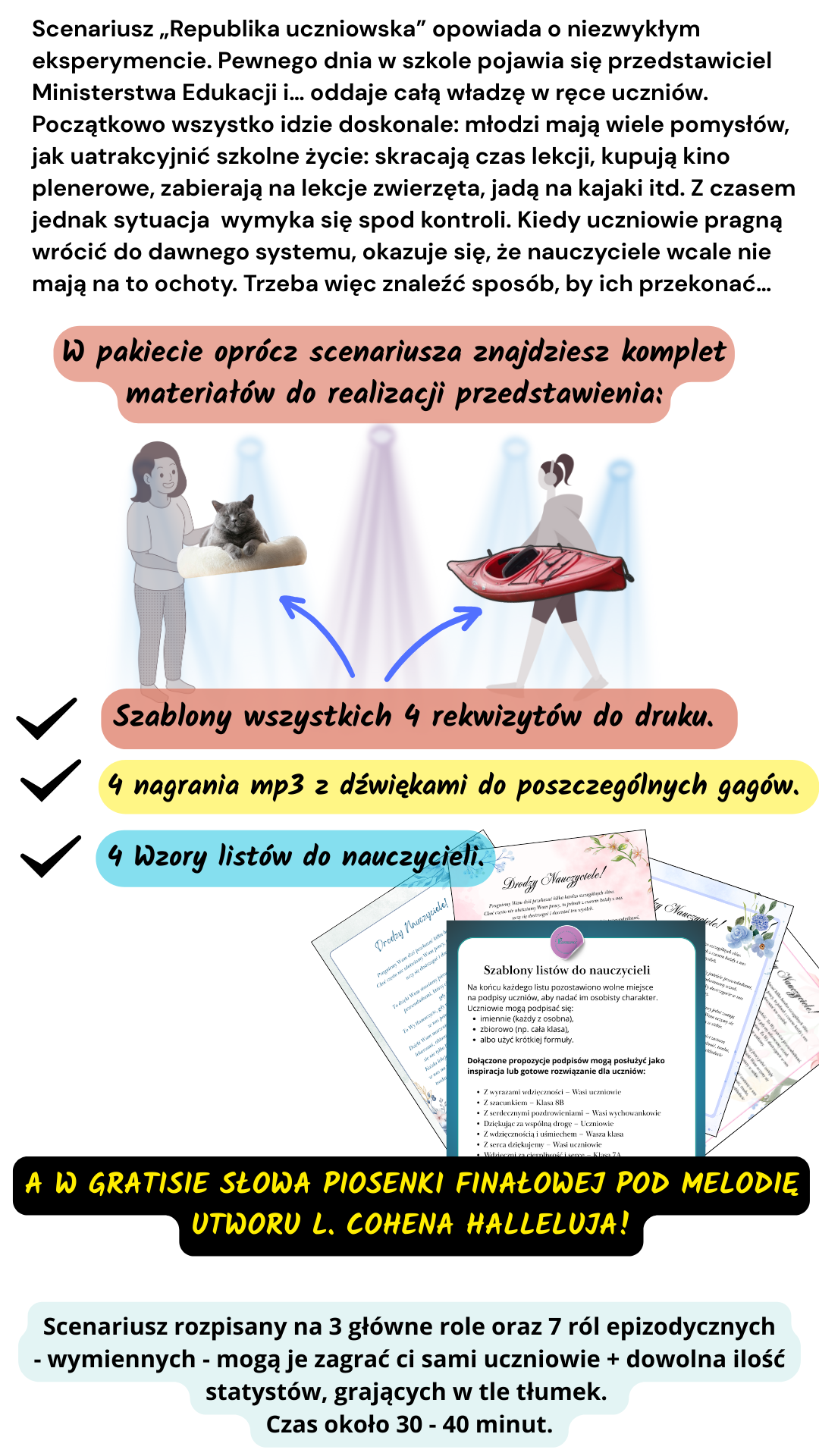 Nowość na Dzień Edukacji Narodowej! Ten scenariusz na DEN z dodatkami pt.: „Republika uczniowska” to kompletny zestaw materiałów – wystarczy rozdać role, kilka prób i gotowe!