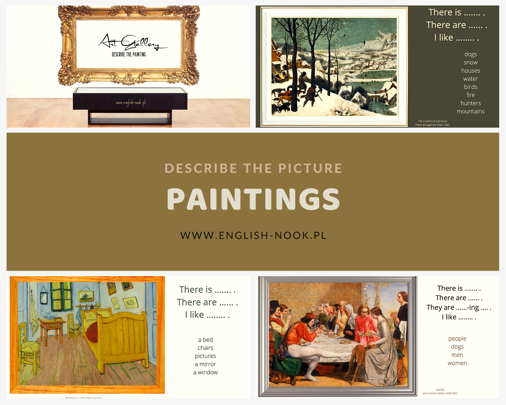 Zestaw 8 obrazów służących jako materiał stymulujący - do poćwiczenia, utrwalenia struktur There is / there are, czasu Present Continuous, opisu obrazka, wyrażania opinii, słownictwa z różnych zakresów tematycznych (ubrania, sprzęty w pokoju, jedzenie i inne).