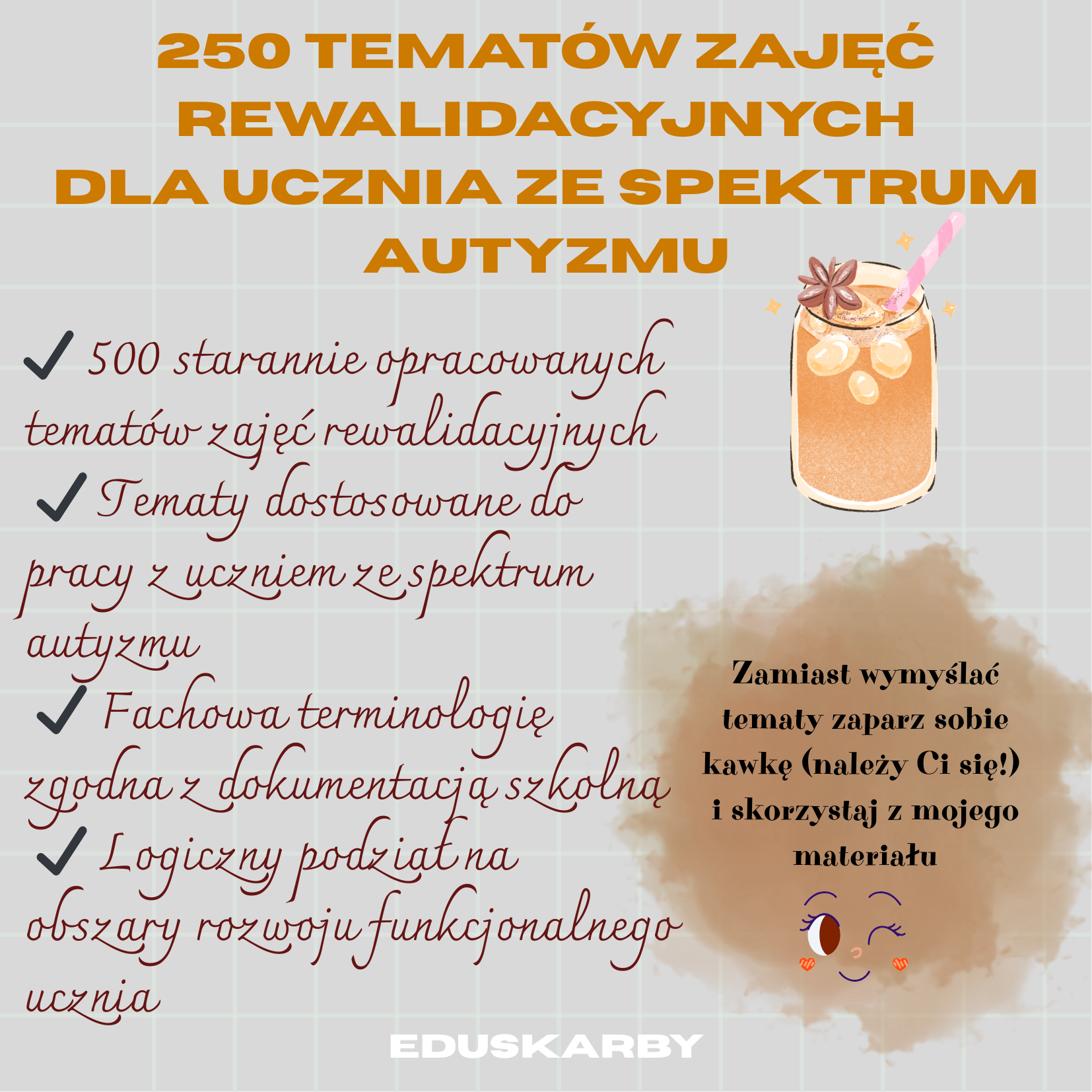 W środku znajdziesz 250 gotowych tematów zajęć rewalidacyjnych, sformułowanych fachowym językiem, gotowych do wpisania do dziennika i zgodnych z pracą z uczniem ze spektrum autyzmu.