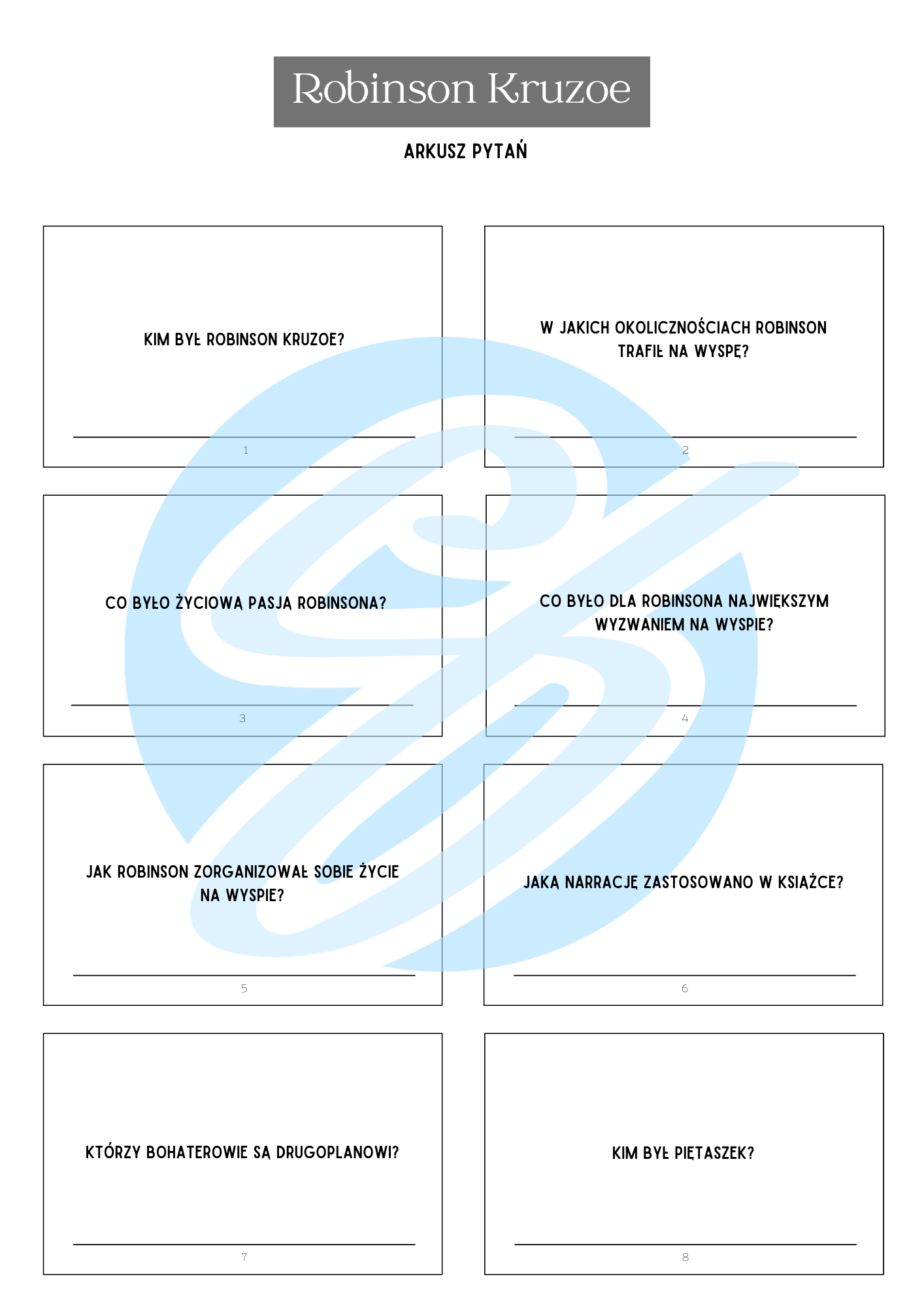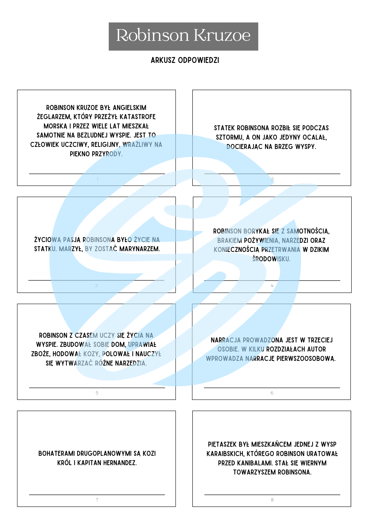 Chcesz, aby omawianie Robinsona Crusoe Daniela Defoe było ciekawsze i skuteczniejsze? Nasz zestaw „Robinson Crusoe – Pytania i Odpowiedzi” to interaktywne karty, które pomogą uczniom lepiej zrozumieć treść, bohaterów i przesłanie lektury oraz aktywnie uczestniczyć w zajęciach.