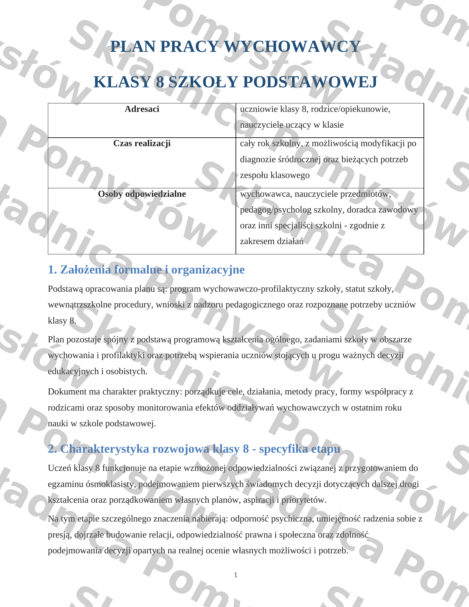 Materiał zawiera kompletny plan pracy wychowawcy klasy 8. Dokument obejmuje założenia pracy wychowawczej, diagnozę potrzeb zespołu klasowego, cele główne i szczegółowe, priorytety wychowawcze, obszary działań wraz z zadaniami, metodami, formami pracy i oczekiwanymi efektami. Zawiera także roczny harmonogram tematów godzin wychowawczych od września do czerwca, rekomendowane metody pracy, zasady monitorowania i ewaluacji oraz praktyczną checklistę dokumentacji wychowawcy. To materiał uporządkowany, gotowy do wykorzystania i łatwy do dostosowania do specyfiki własnej klasy.
