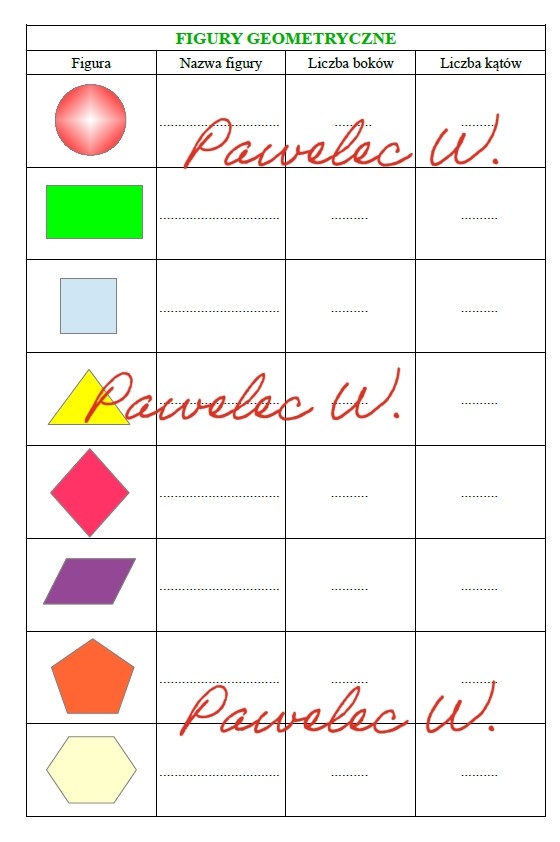 Tabela pomocna w nauce i rozróżnianiu figur geometrycznych.