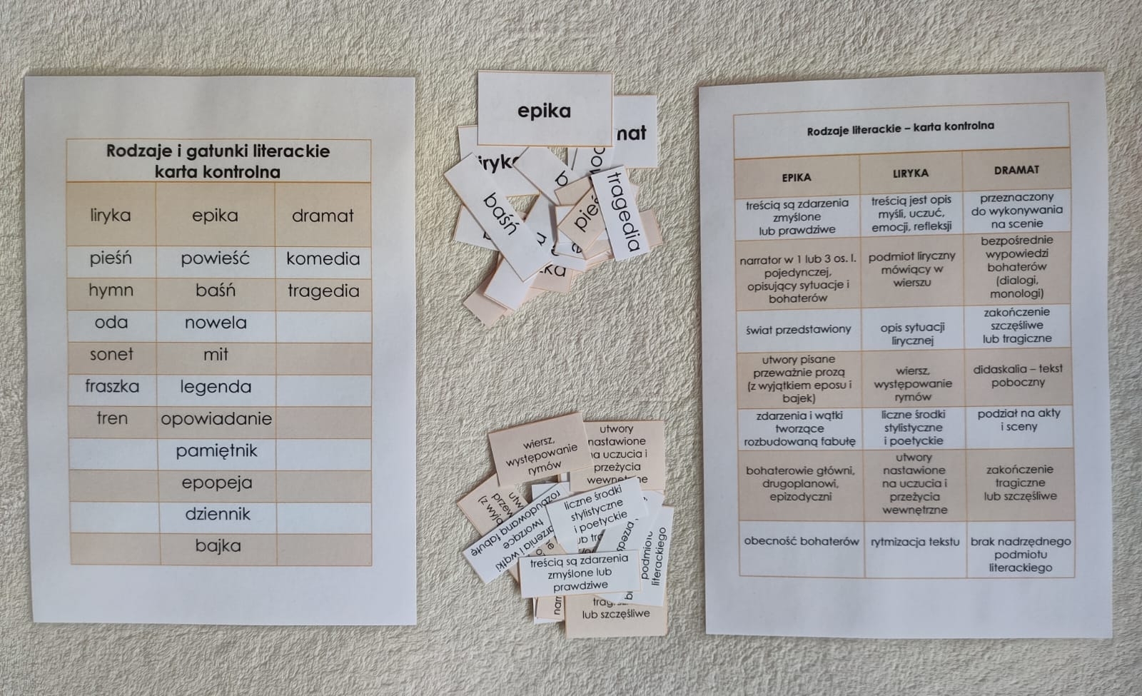 W drugim przypadku uczeń klasyfikuje gatunki literackie do właściwych rodzajów.