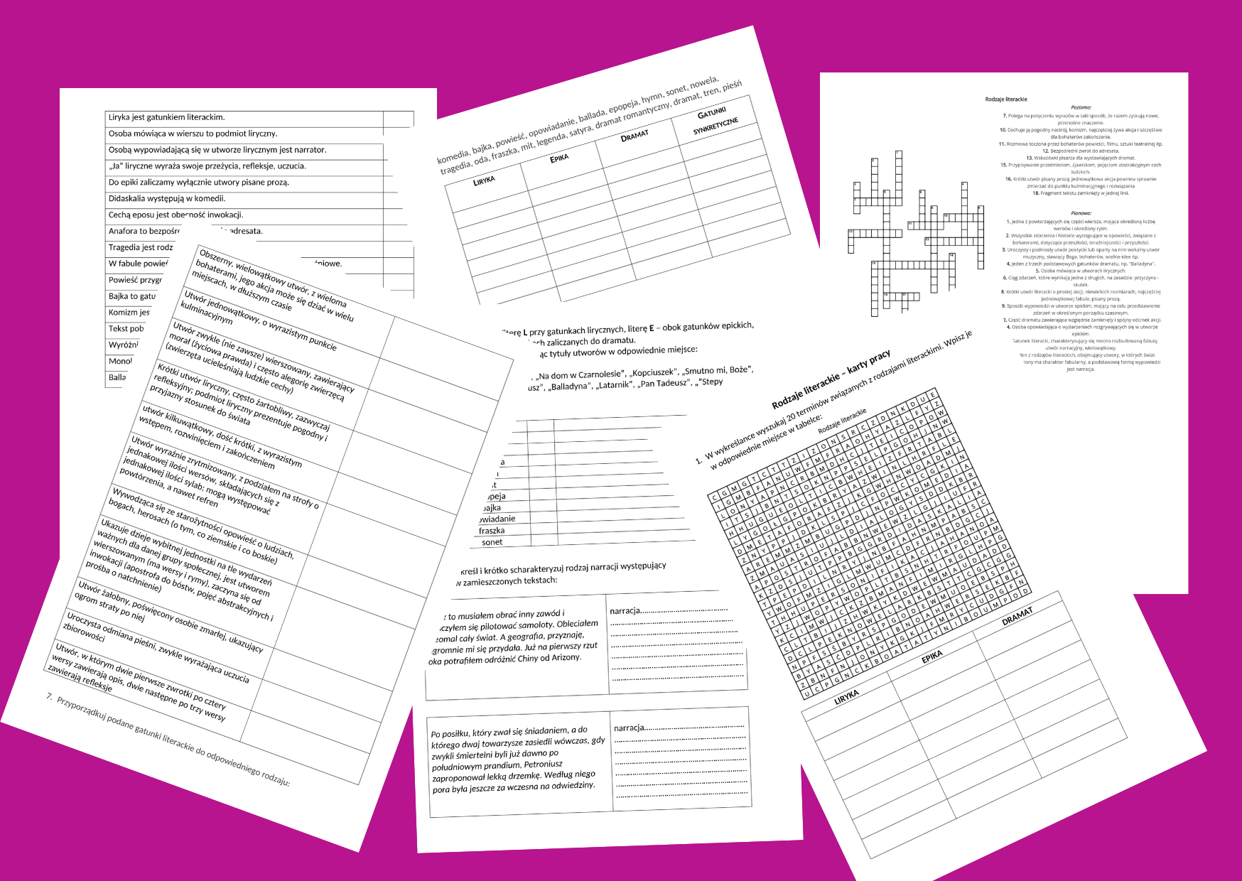 Zestaw „RODZAJE I GATUNKI LITERACKIE” to komplet 9 stron ćwiczeń, które pomagają utrwalić i sprawdzić znajomość podstawowych pojęć literackich.