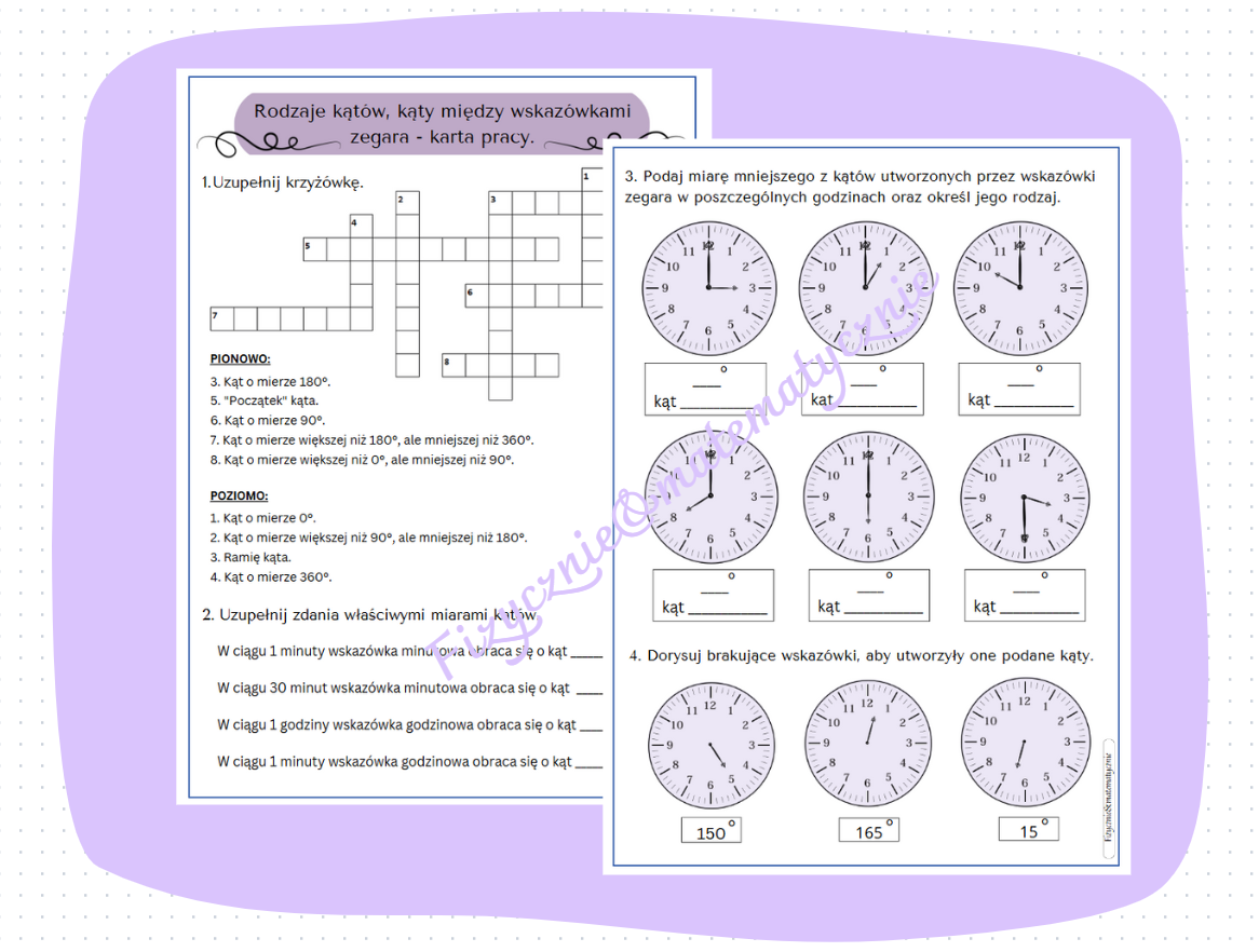 Materiał zawiera zadania sprawdzające znajmość rodzajów kątów oraz odczytywania miar kątów utworzonych przez wskazówki zegara. Może być wykorzystany jako kartkówka lub karta pracy.