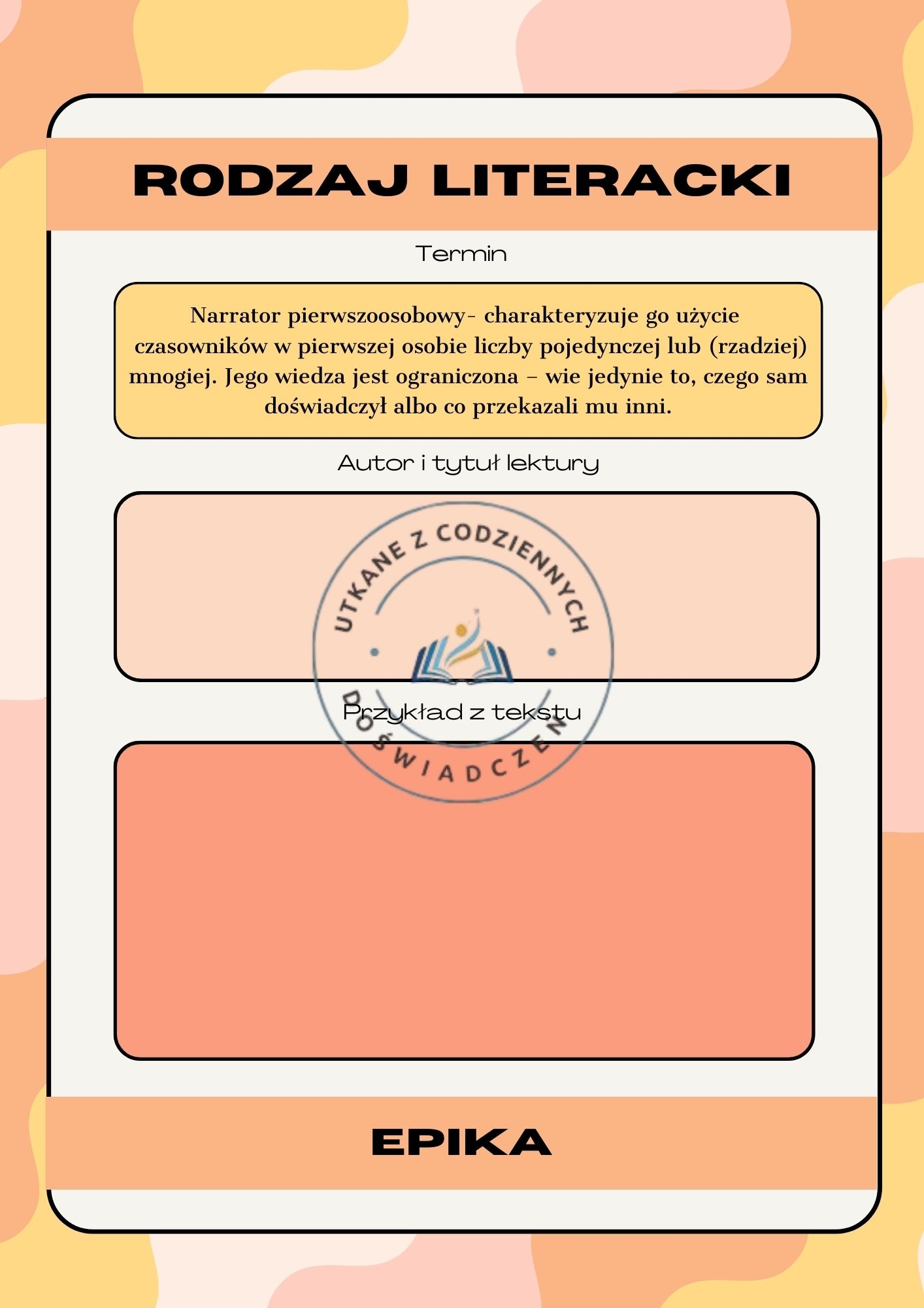 Ten materiał to kompletny, przemyślany i niezwykle praktyczny zestaw kart pracy, który pozwala uczniom zrozumieć, uporządkować i utrwalić najważniejsze pojęcia związane z rodzajami literackimi. Każda karta skupia się na jednym terminie — od didaskaliów, przez narratora wszechwiedzącego, aż po sonet czy hymn — dzięki czemu uczniowie pracują w sposób jasny, uporządkowany i bez przytłoczenia.
