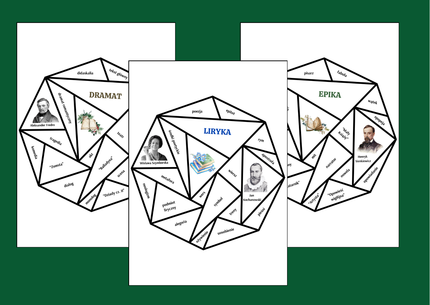 Zestaw 3 puzzli, które zawierają portrety autorów, terminy, utwory i skojarzenia związane z epiką, liryką i dramatem. Można wykorzystać każdy rodzaj oddzielnie lub wszystkie – mają ten sam układ.