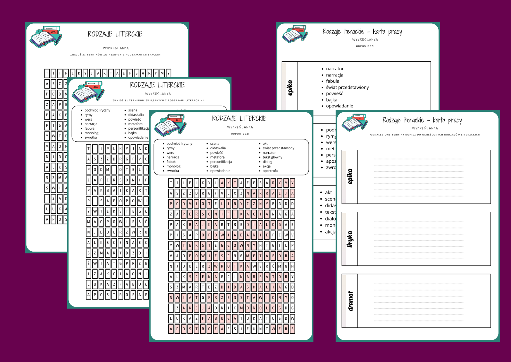 Materiał zawiera wykreślankę dotyczącą rodzajów literackich (3 wersje: z odpowiedziami, bez odpowiedzi, bez wyrazów do odnalezienia) oraz kartę pracy.