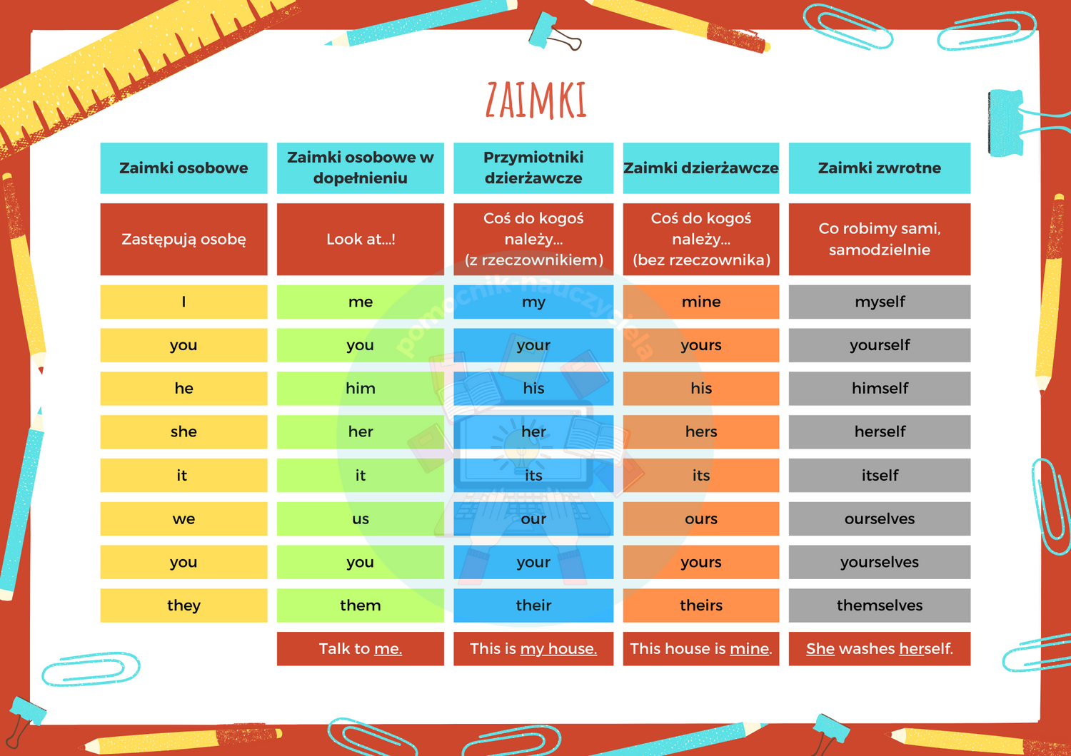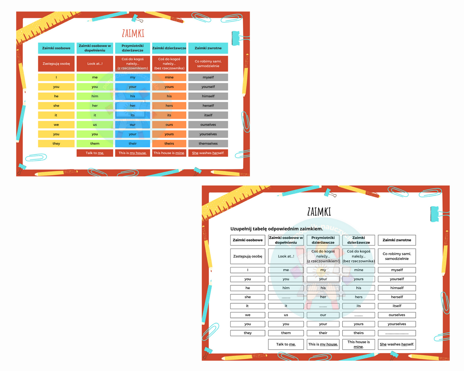 Materiał "Rodzaje zaimków" zawiera 1 plik w formacie .pdf. W dokumencie znajduje się tabela z zaimkami i przymiotnikami dzierżawczymi w formie prezentacyjnej, kolorowej oraz w formie karty pracy -  tabela z kilkoma lukami.  Zachęcam do pobierania.